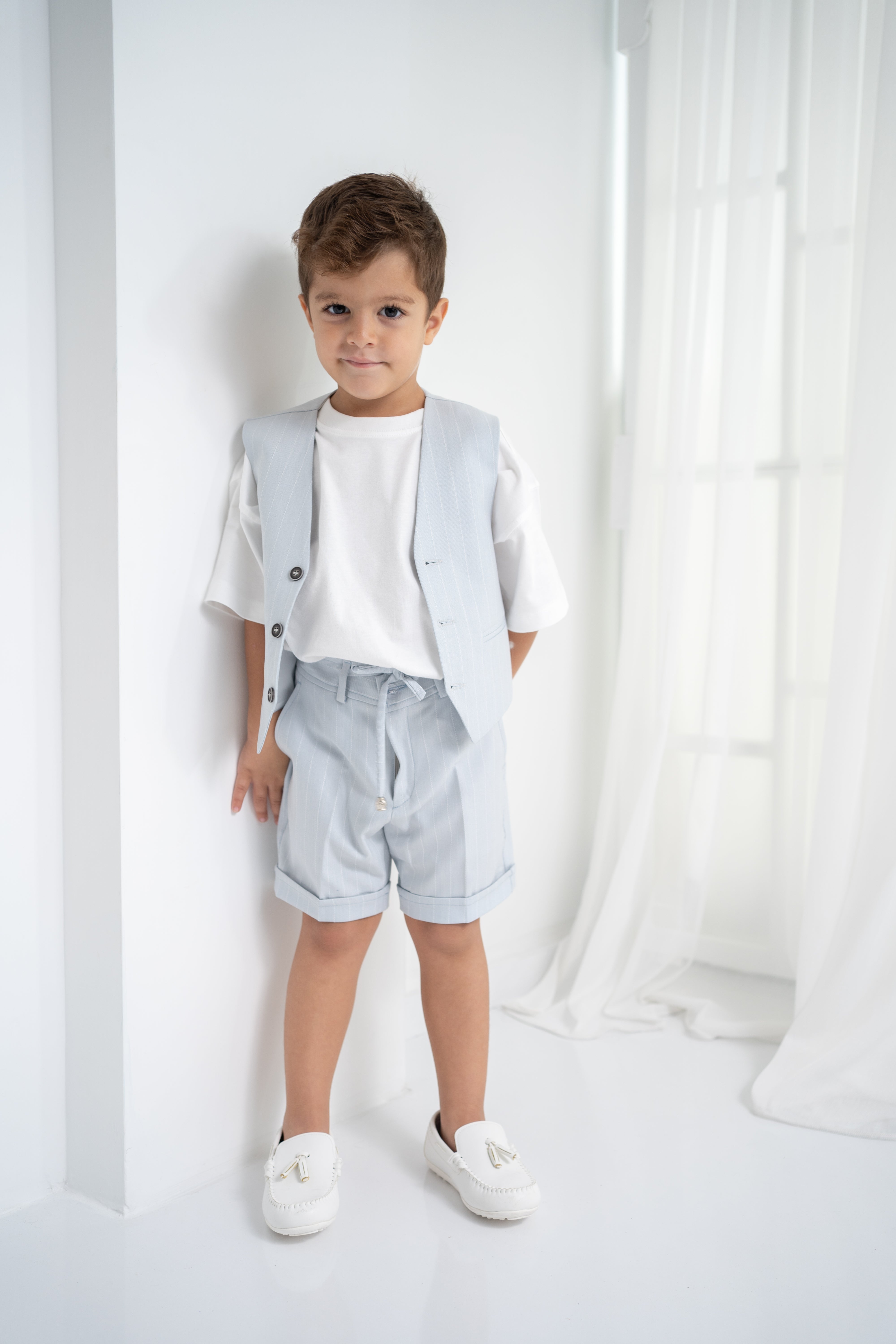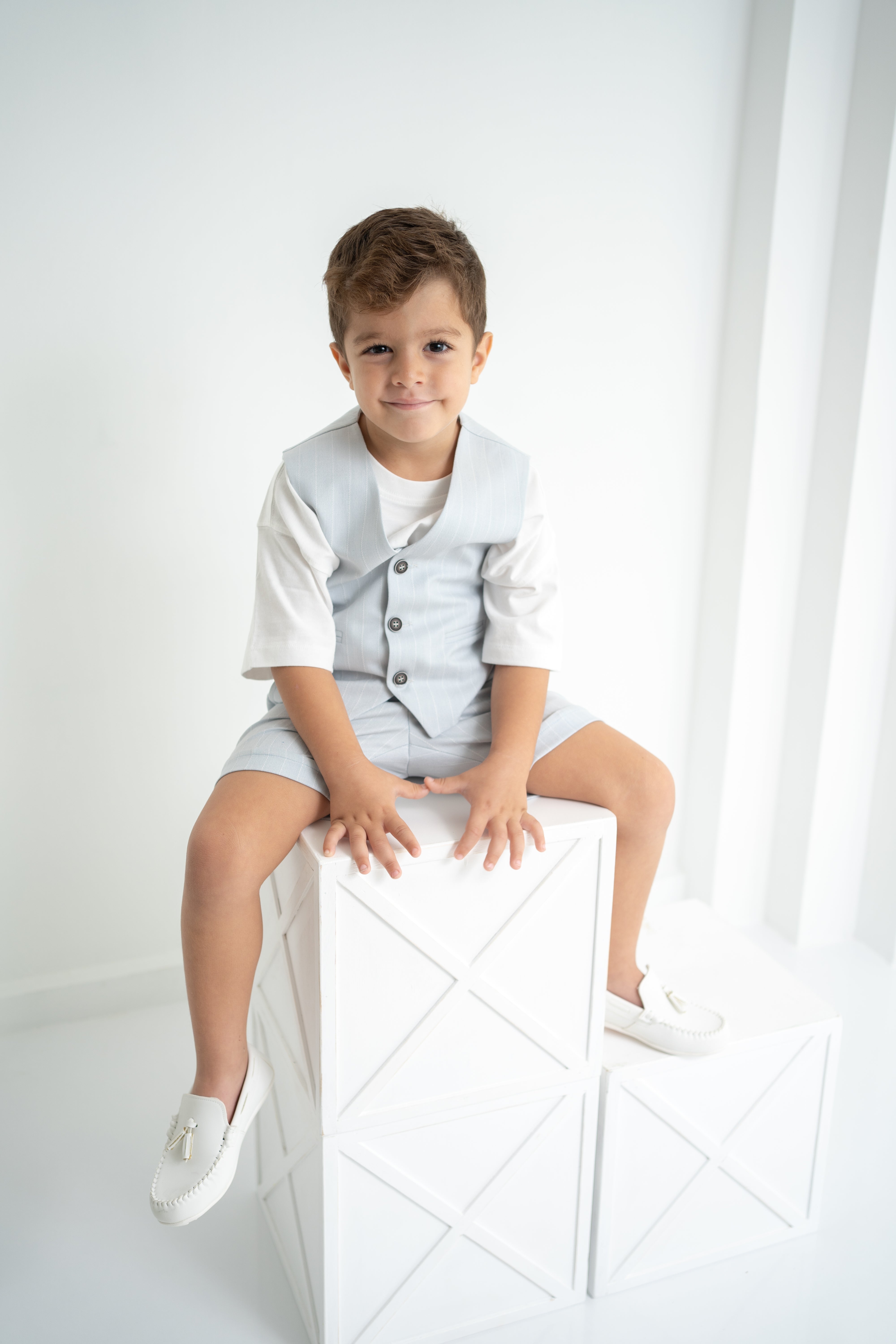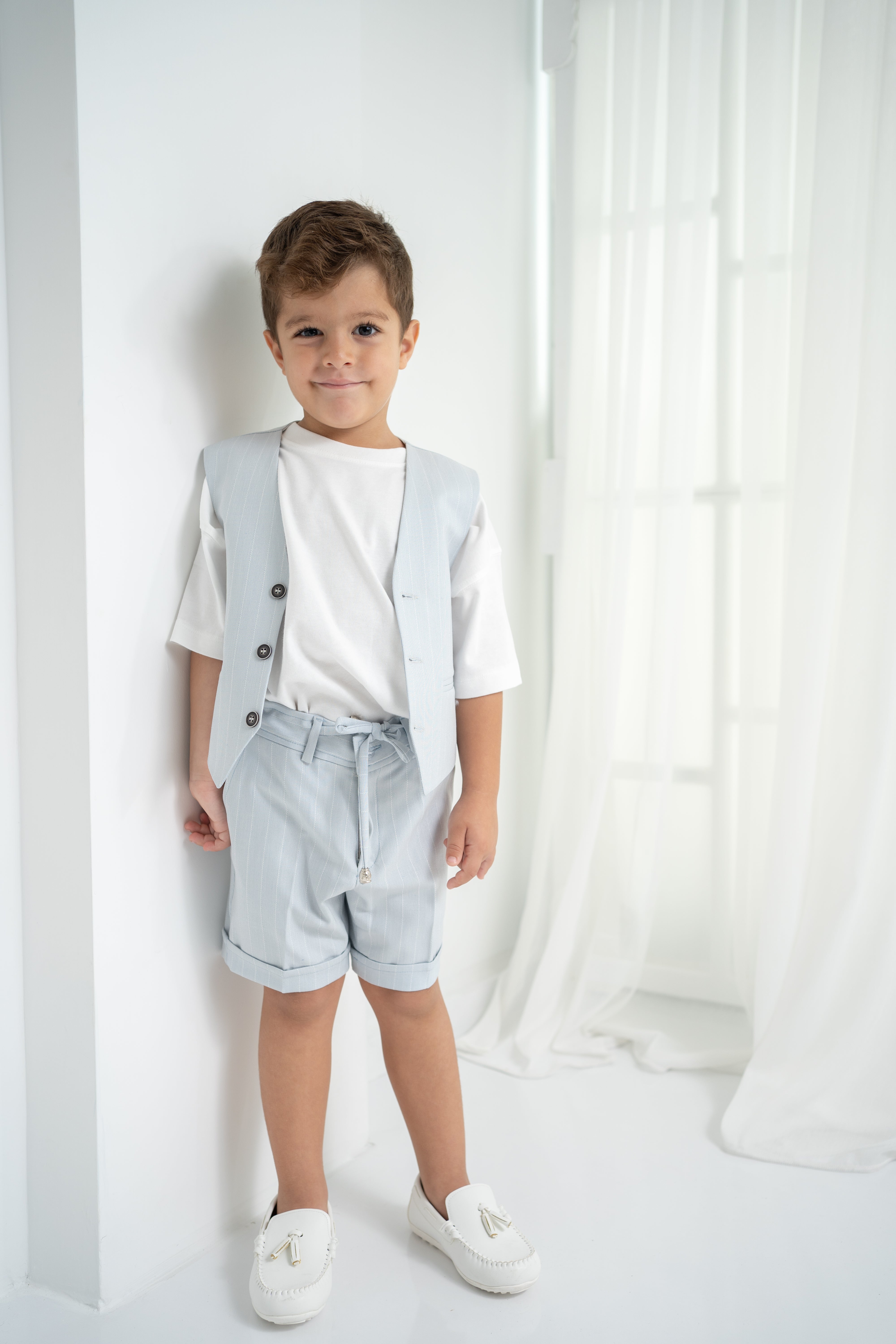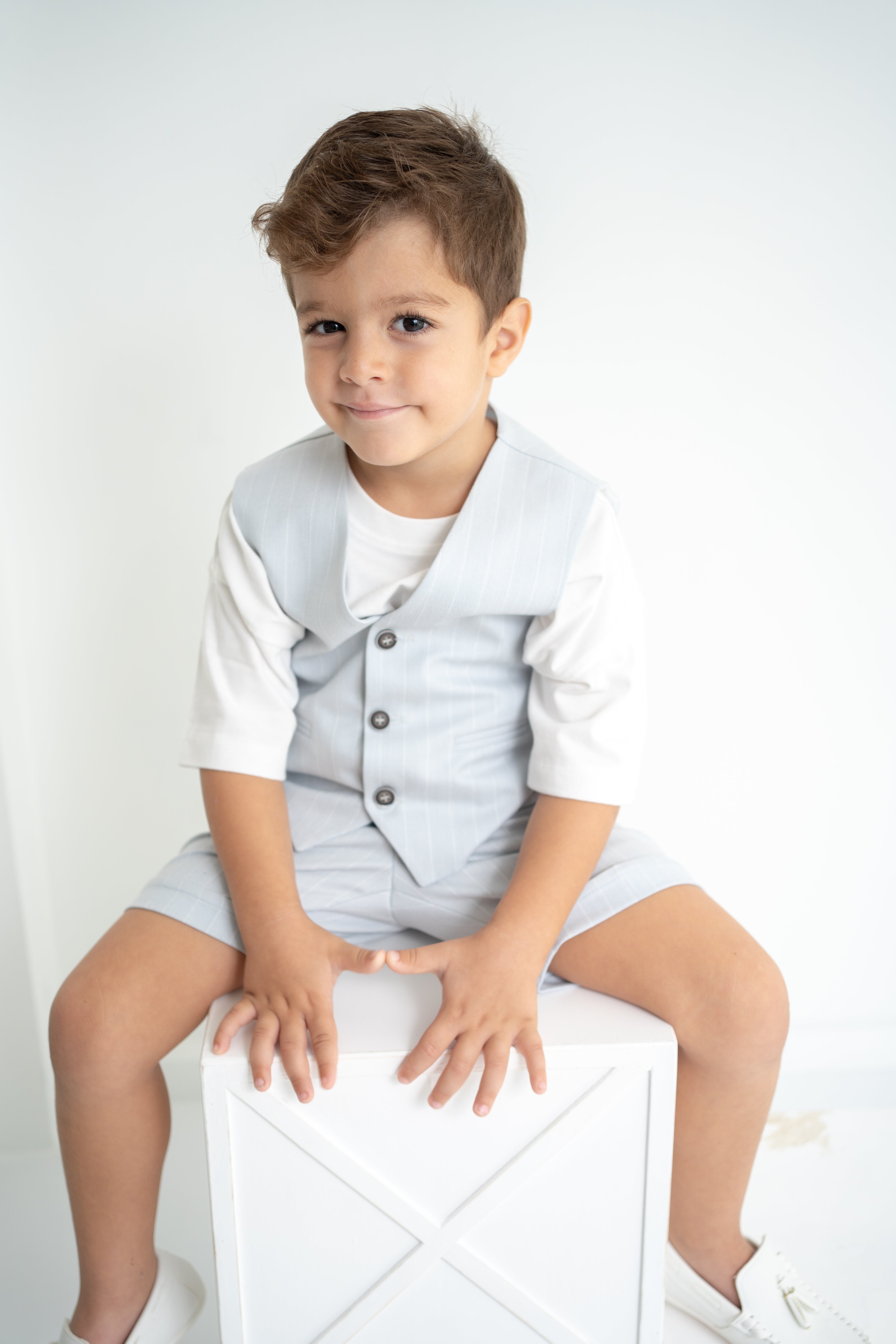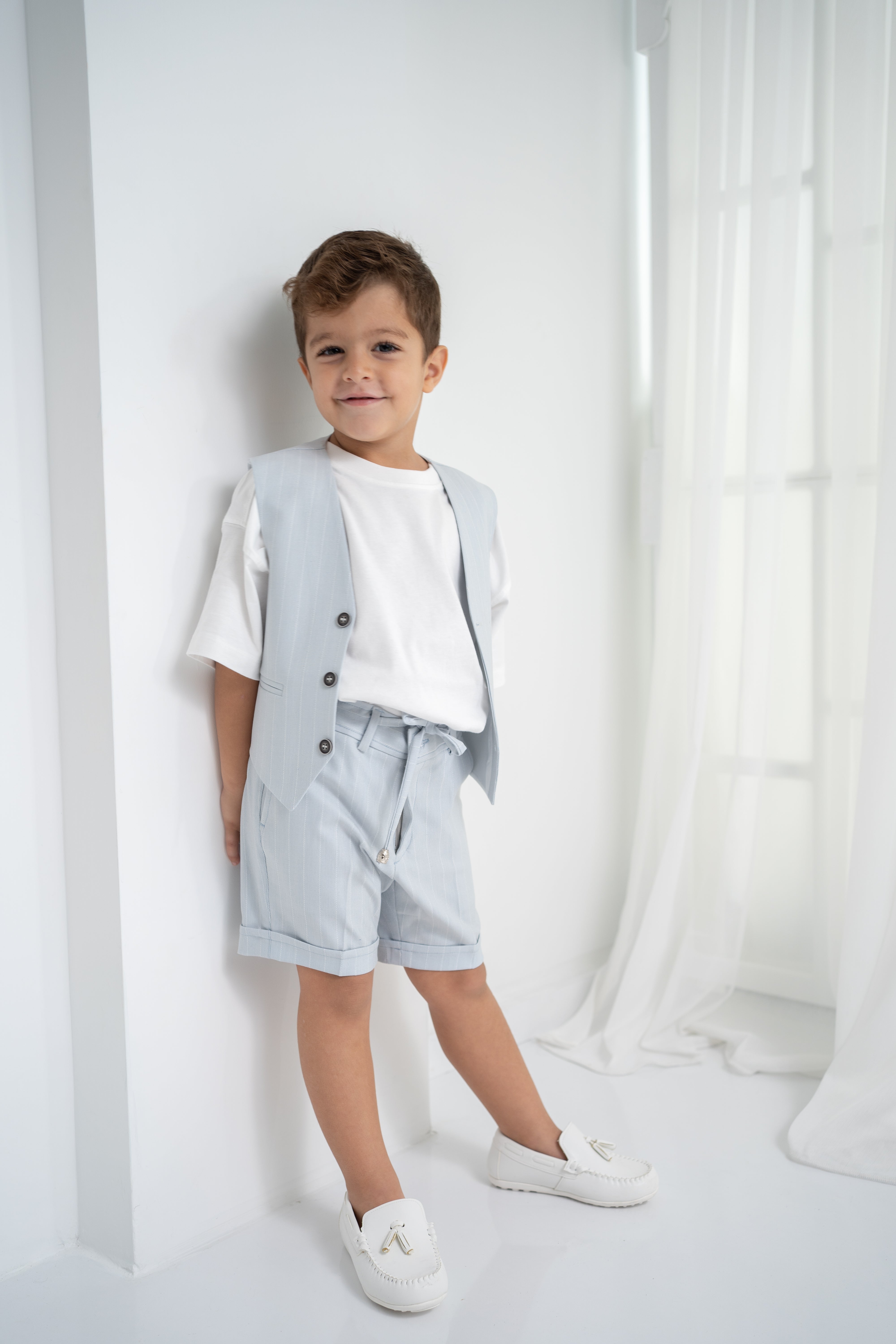 Şıklığı ve rahatlığı bir arada sunan erkek çocuk 3’lü takım, özel günlerden günlük kullanıma kadar her an için ideal. Krem-beyaz tişört, ince çizgili bej yelek ve şort ile modern ve zarif bir görünüm sağlar. Yumuşak dokulu kumaşı sayesinde çocukların hassas cildine uygundur. Düğmeli yelek detayı ve ayarlanabilir bel lastikli şort ile hem konforlu hem de şık bir deneyim sunar.