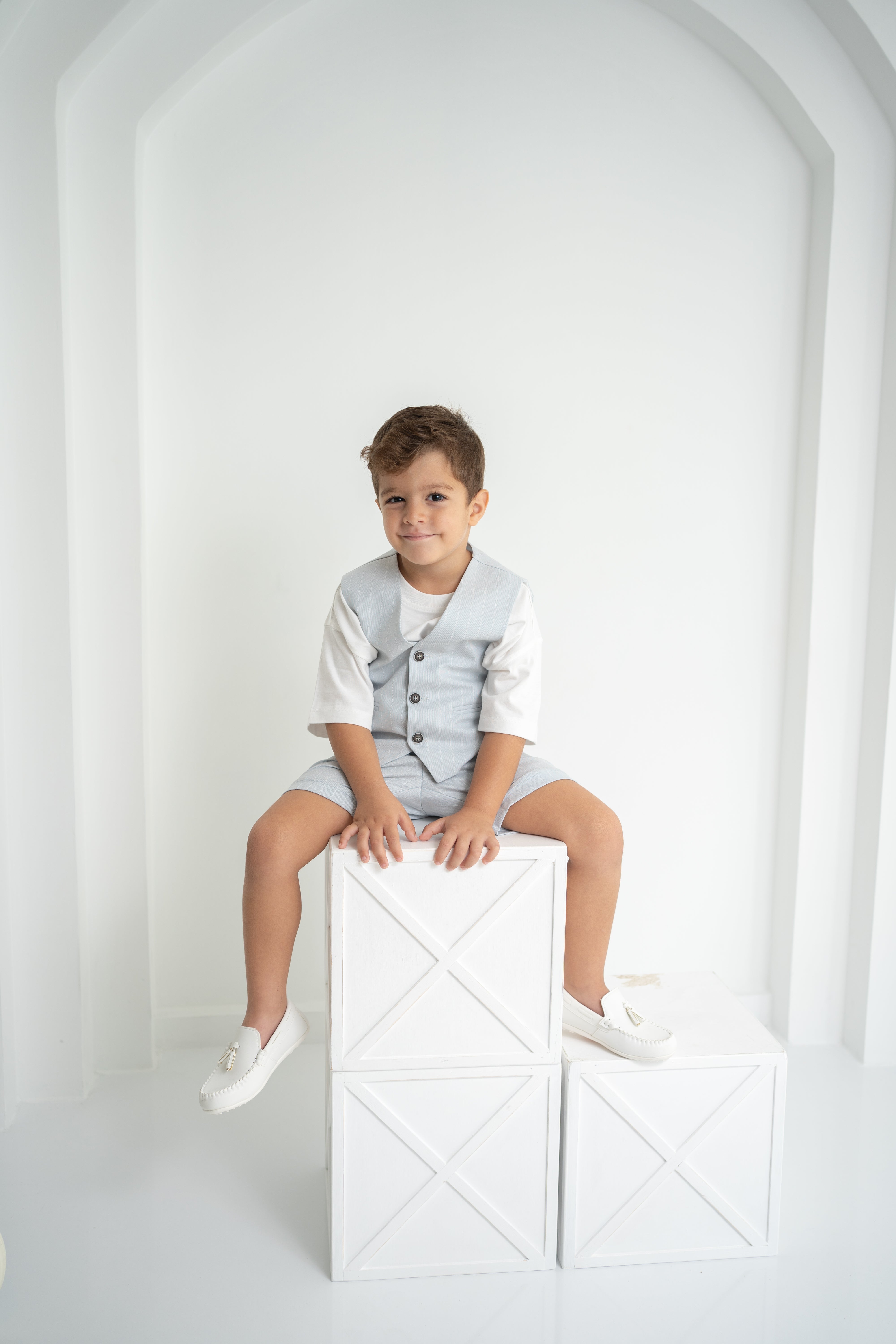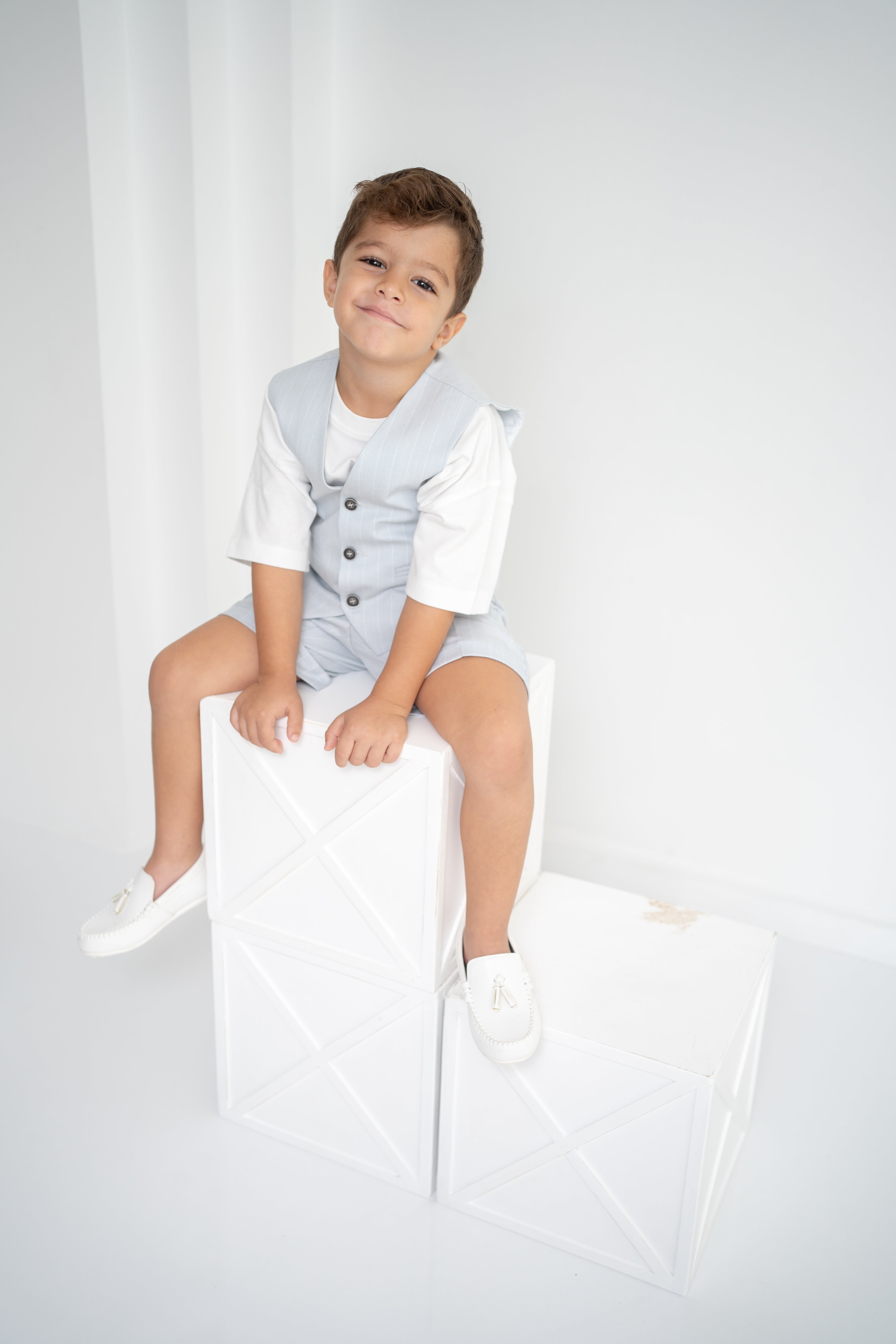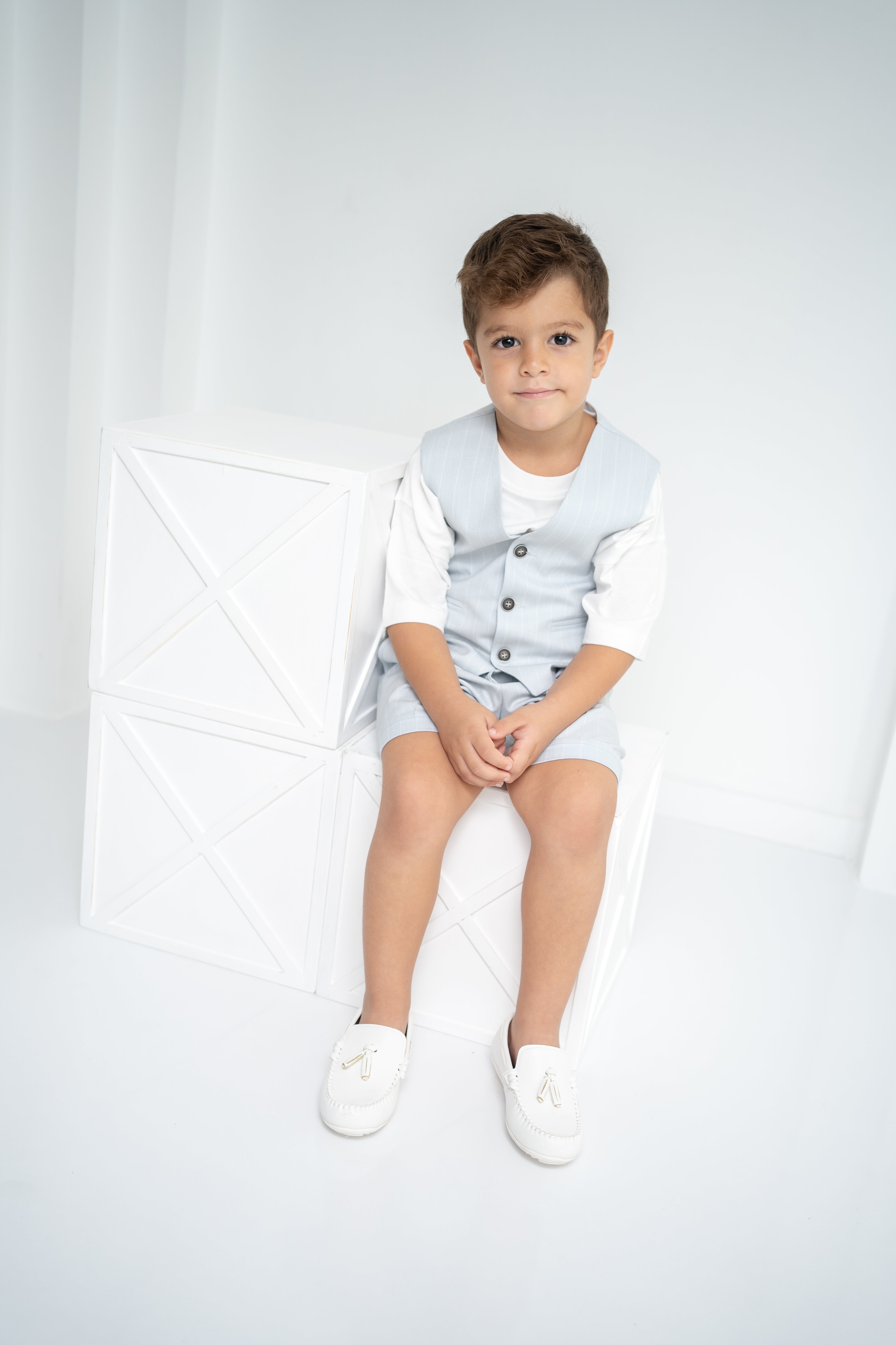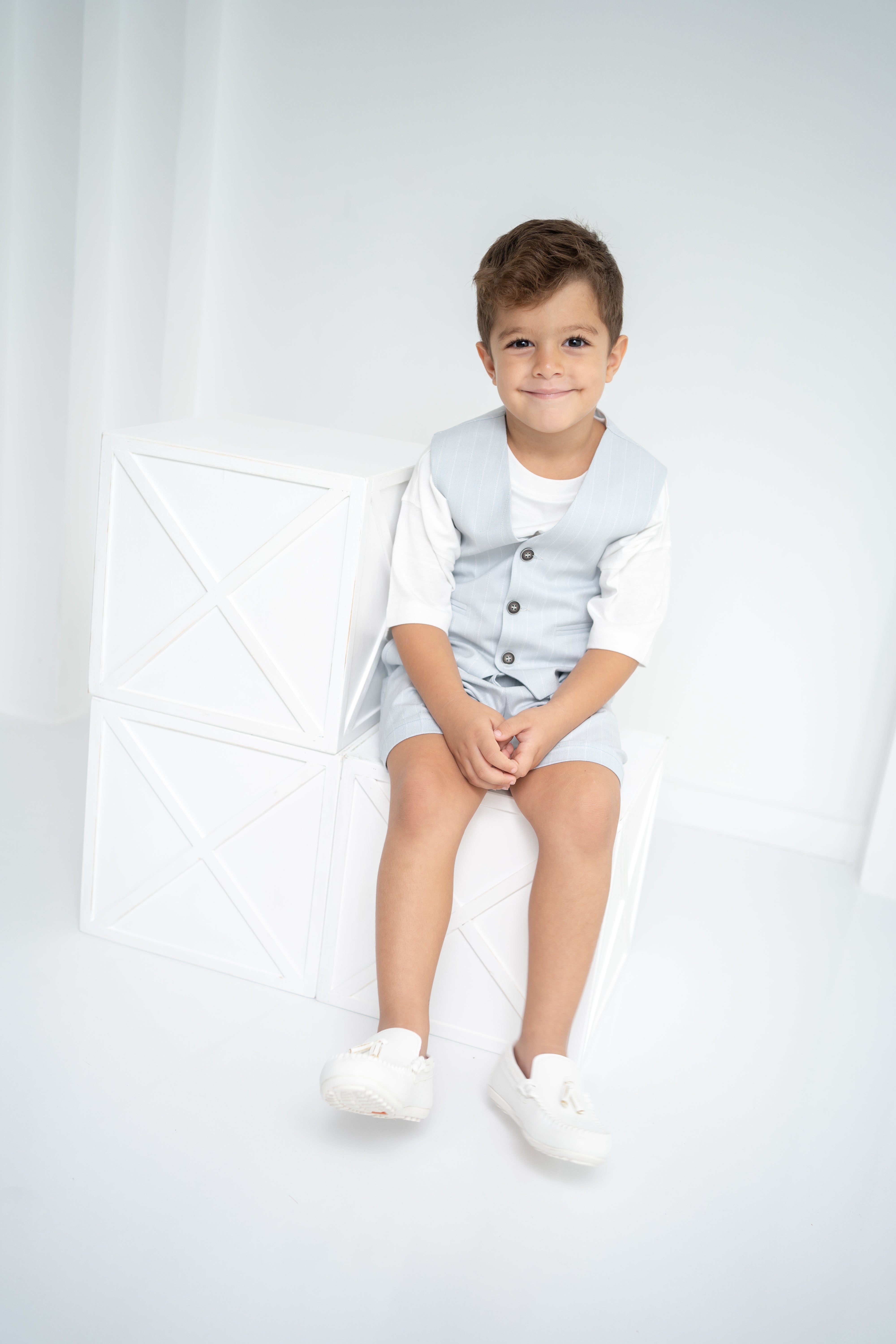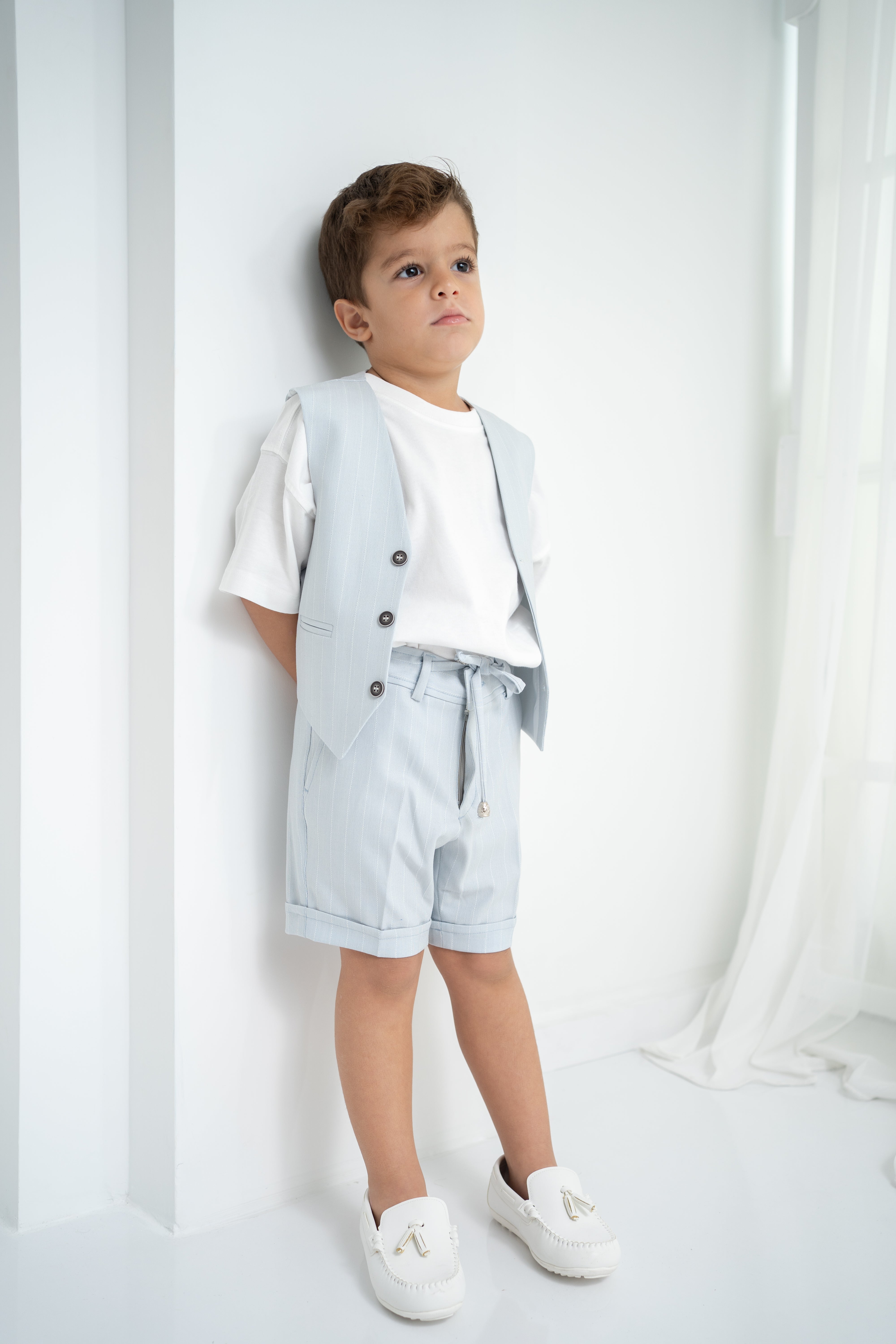 Şıklığı ve rahatlığı bir arada sunan erkek çocuk 3’lü takım, özel günlerden günlük kullanıma kadar her an için ideal. Krem-beyaz tişört, ince çizgili bej yelek ve şort ile modern ve zarif bir görünüm sağlar. Yumuşak dokulu kumaşı sayesinde çocukların hassas cildine uygundur. Düğmeli yelek detayı ve ayarlanabilir bel lastikli şort ile hem konforlu hem de şık bir deneyim sunar.
