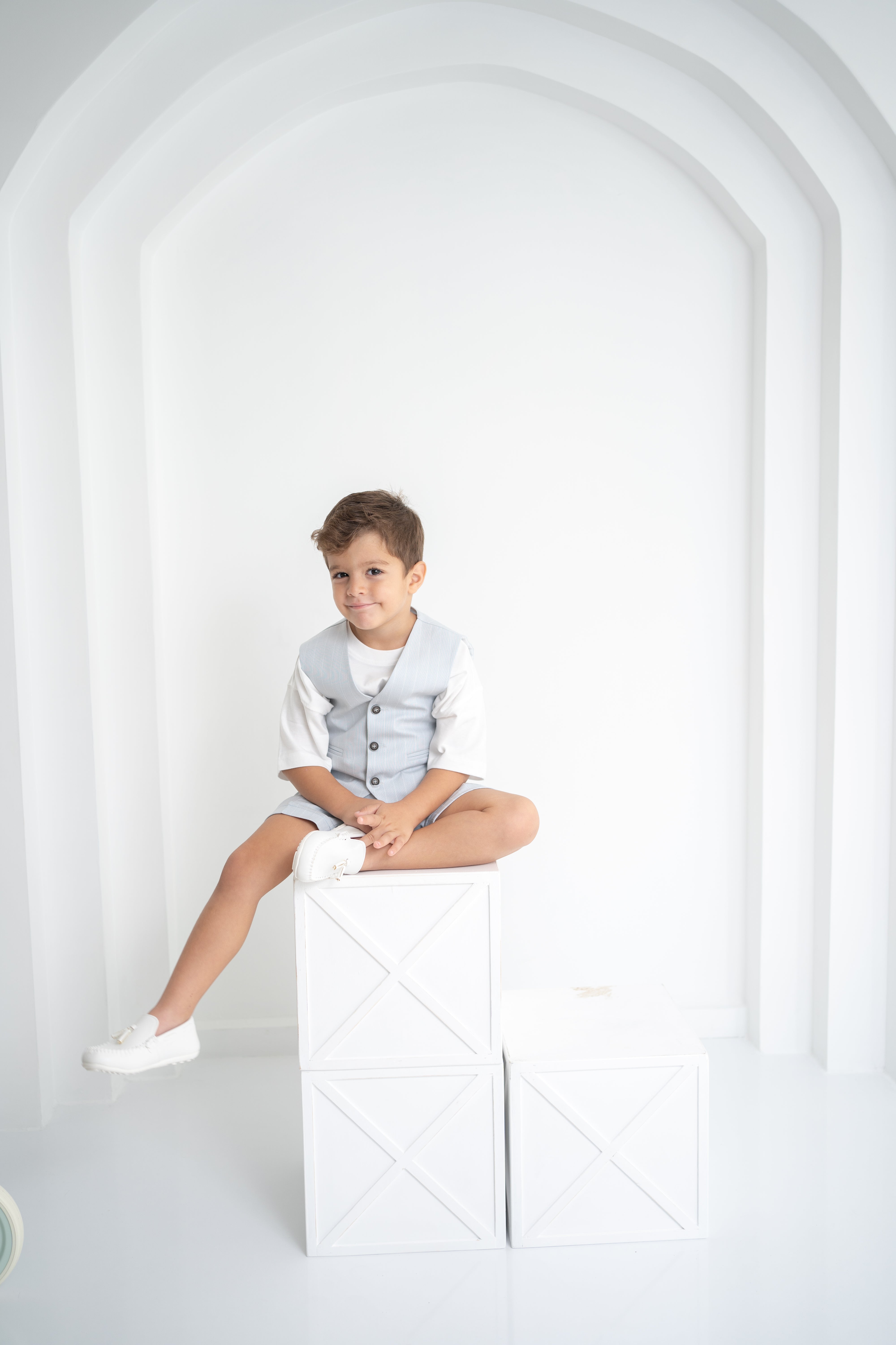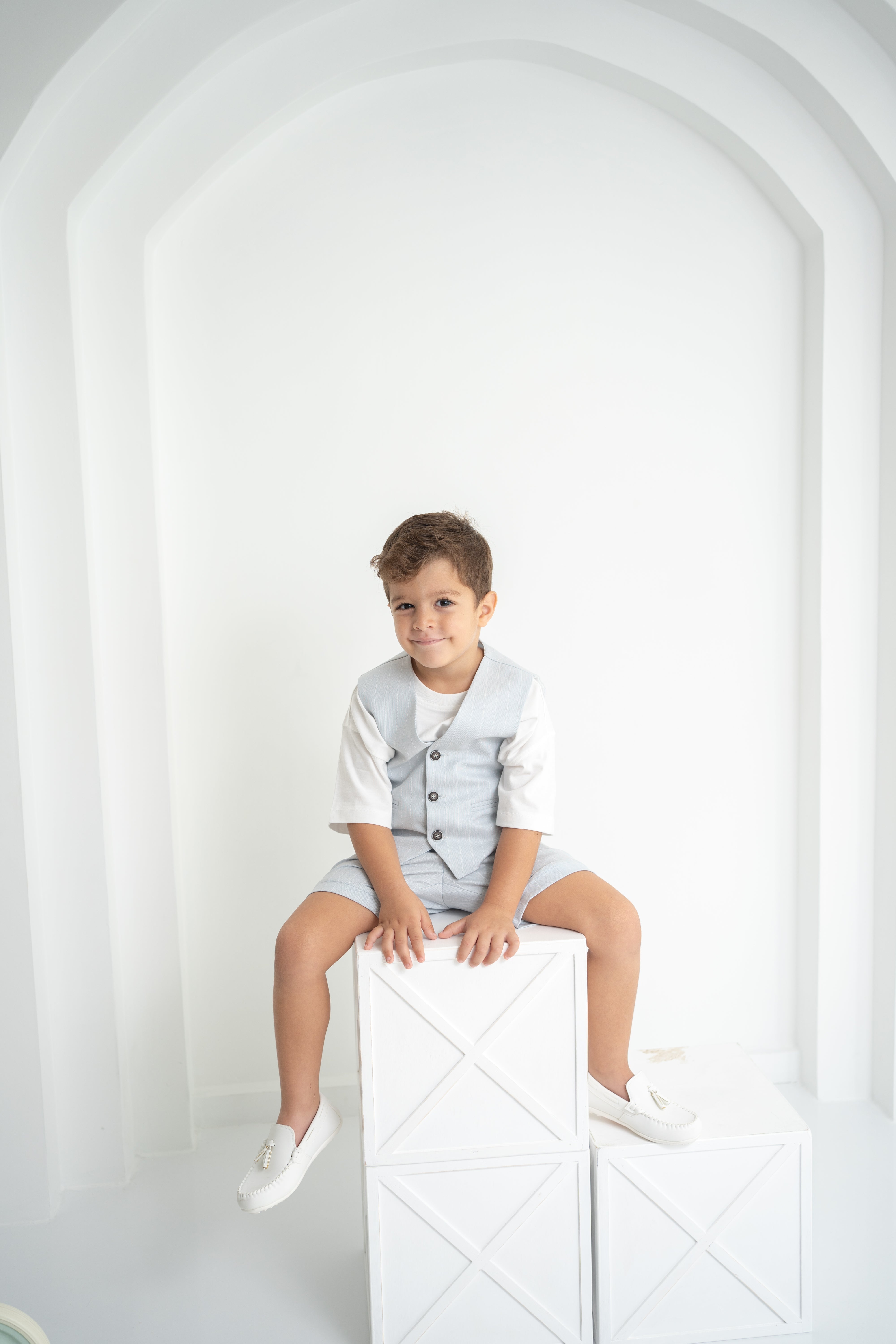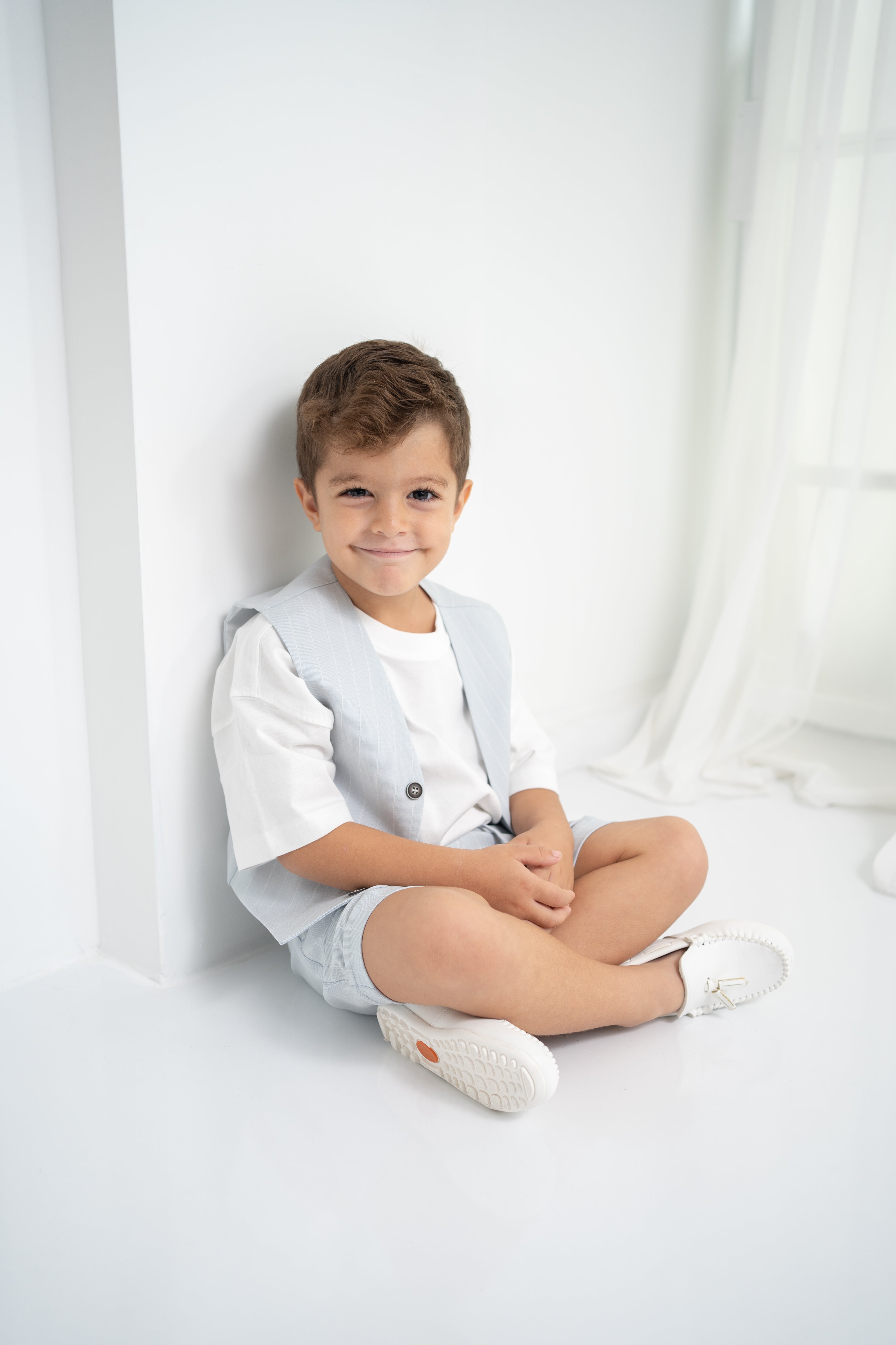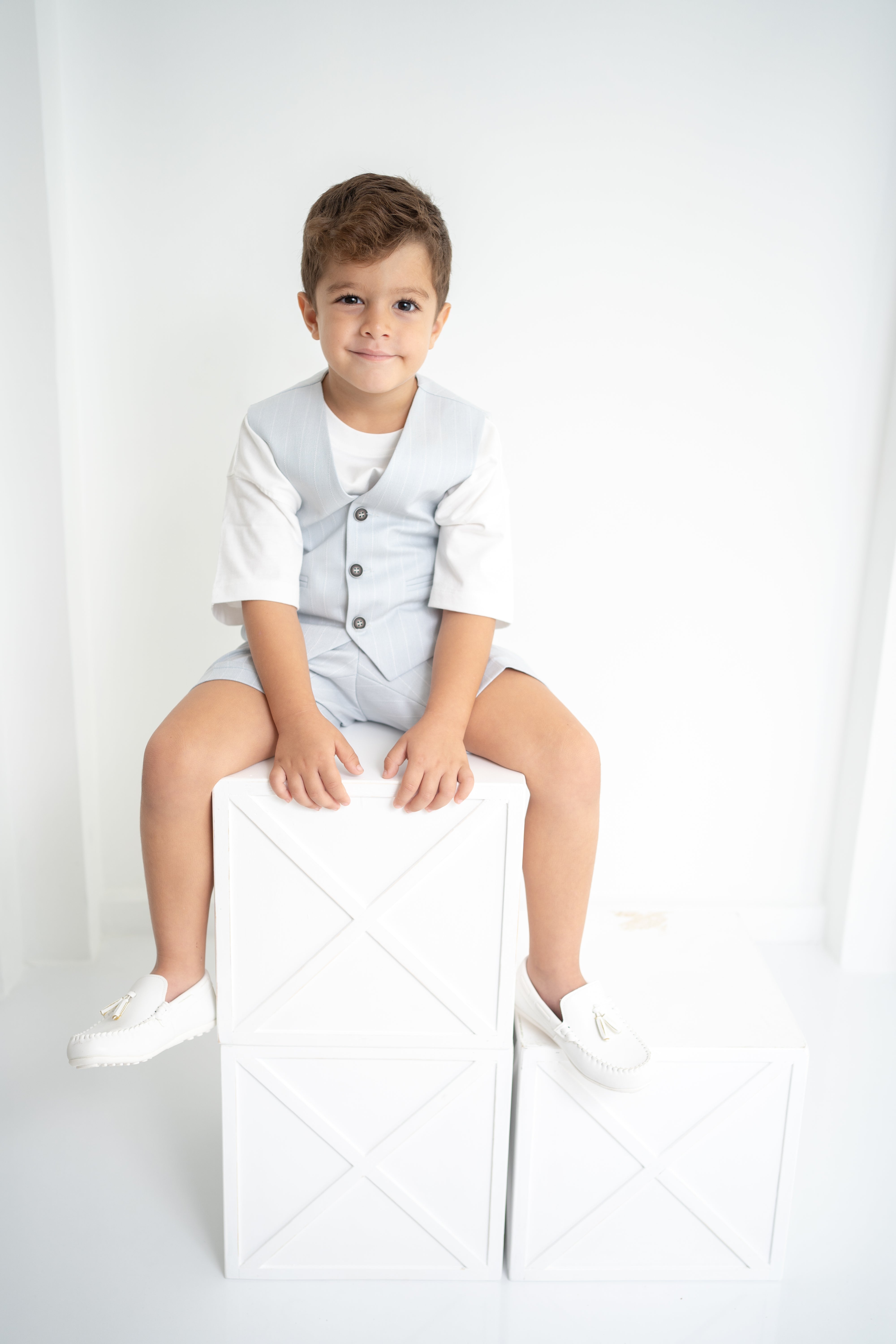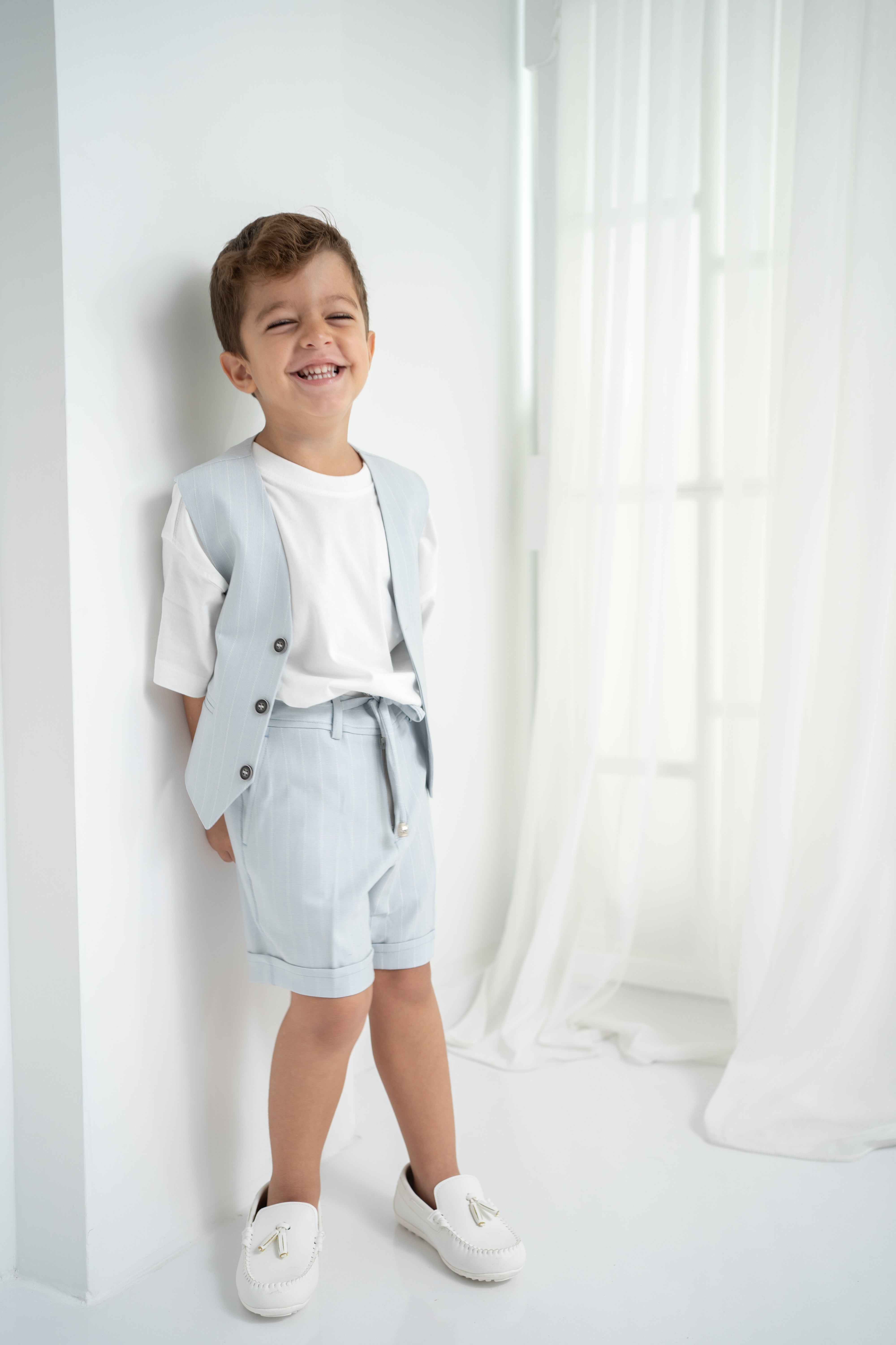 Şıklığı ve rahatlığı bir arada sunan erkek çocuk 3’lü takım, özel günlerden günlük kullanıma kadar her an için ideal. Krem-beyaz tişört, ince çizgili bej yelek ve şort ile modern ve zarif bir görünüm sağlar. Yumuşak dokulu kumaşı sayesinde çocukların hassas cildine uygundur. Düğmeli yelek detayı ve ayarlanabilir bel lastikli şort ile hem konforlu hem de şık bir deneyim sunar.