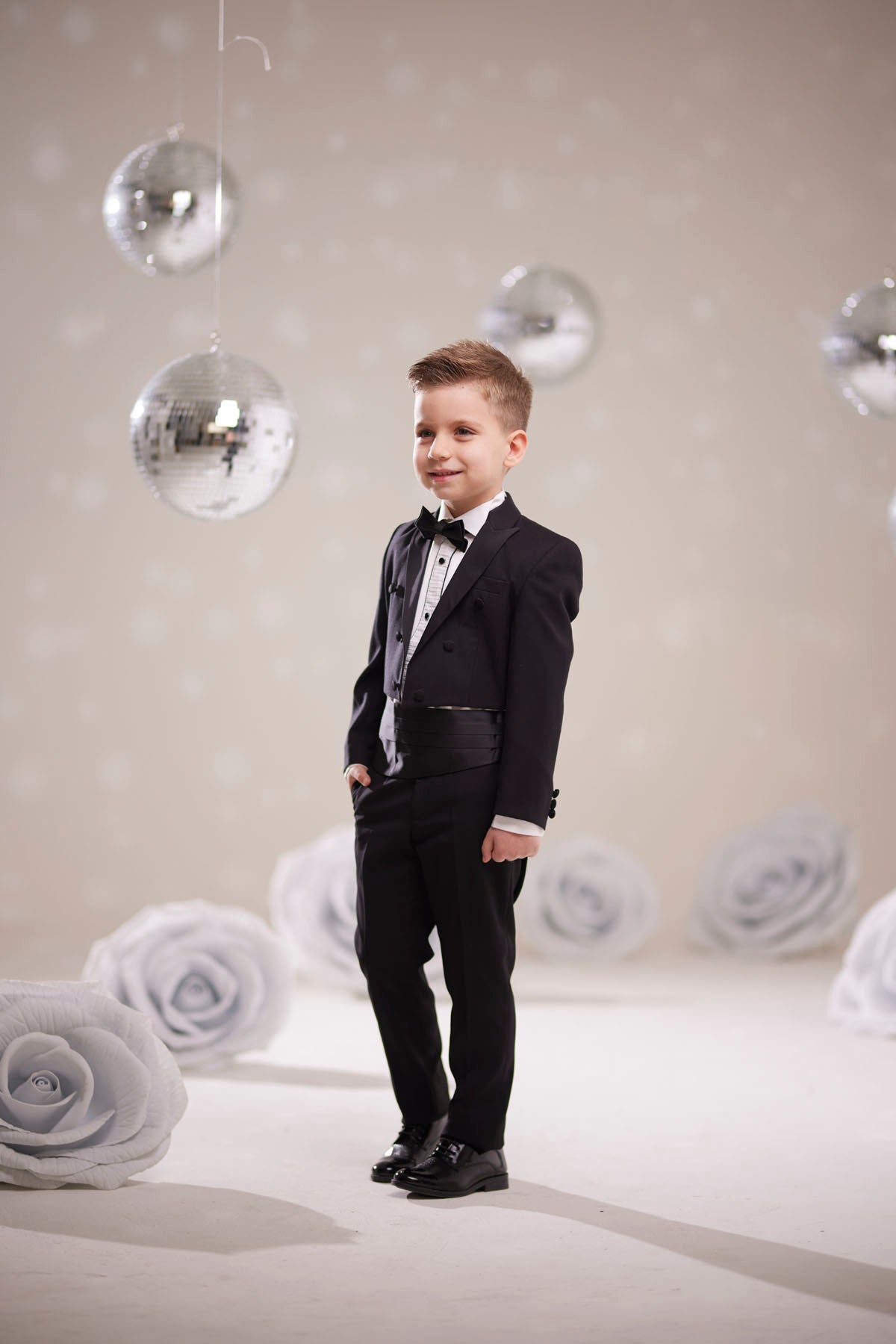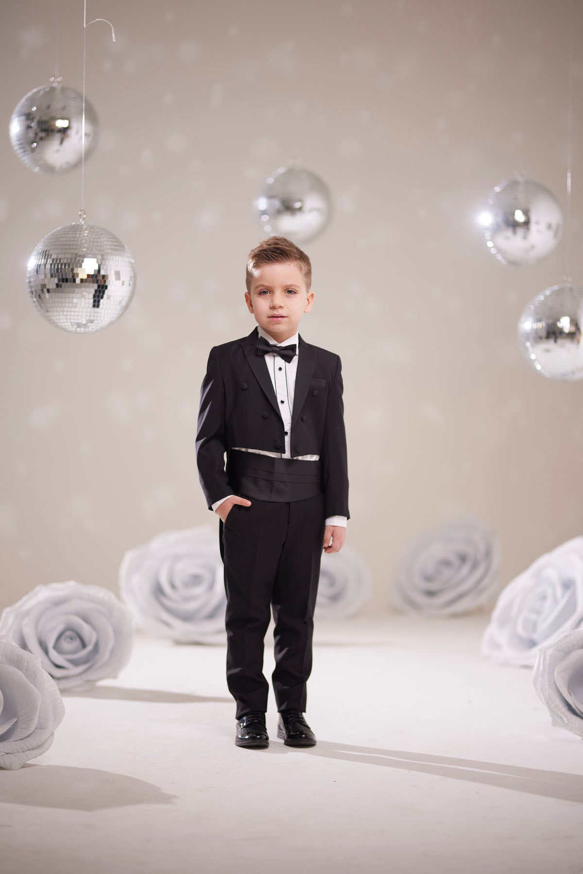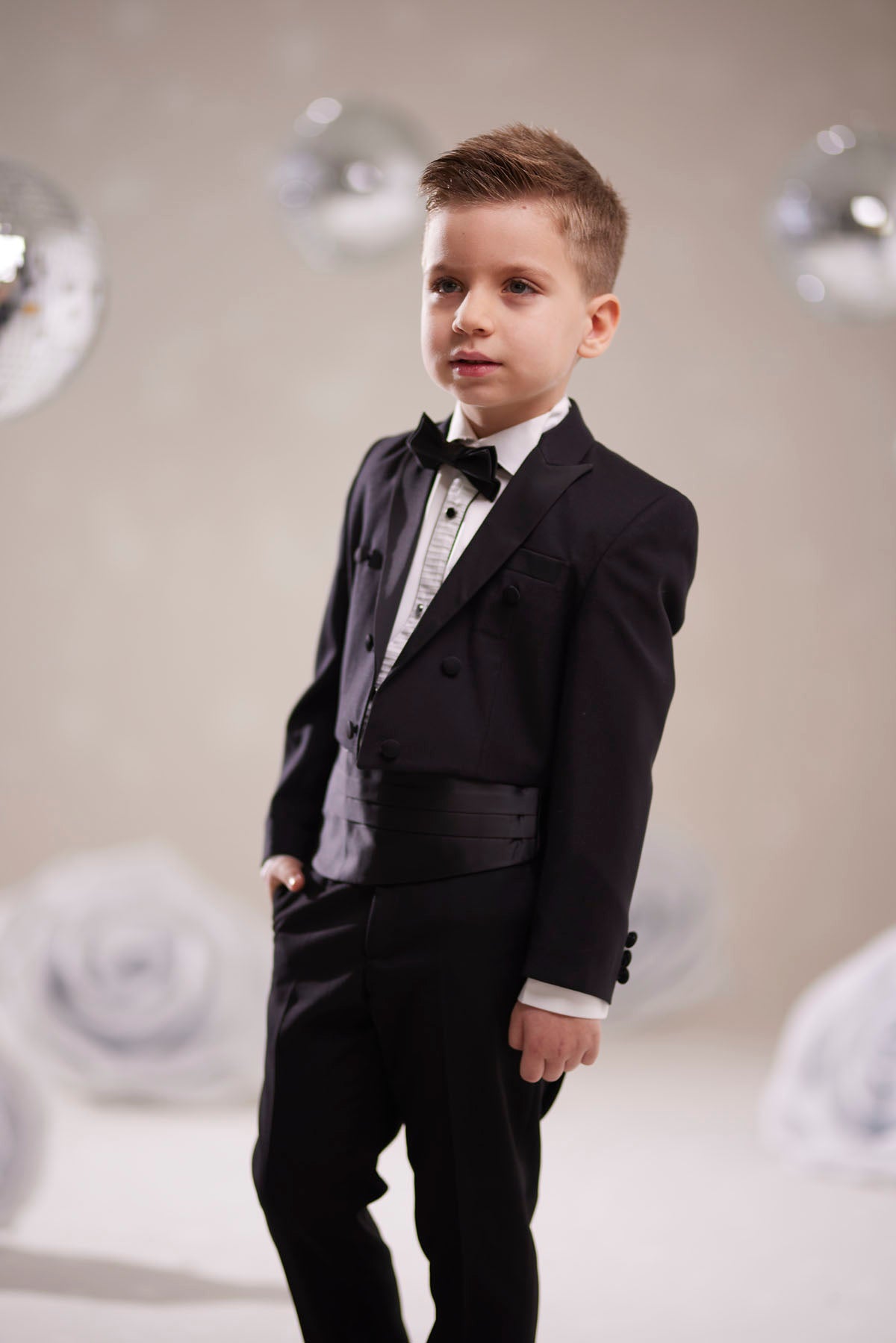 Şıklığın ve zarafetin özel bir ifadesi olan bu siyah çocuk frak smokin takım elbise, minik beyler için özel günlerde fark yaratmak üzere tasarlanmıştır. 1 ila 10 yaş arası çocuklara uygun beden seçenekleriyle sunulan bu takım, klasik tarzı modern kesimle buluşturarak sofistike bir görünüm sağlar.