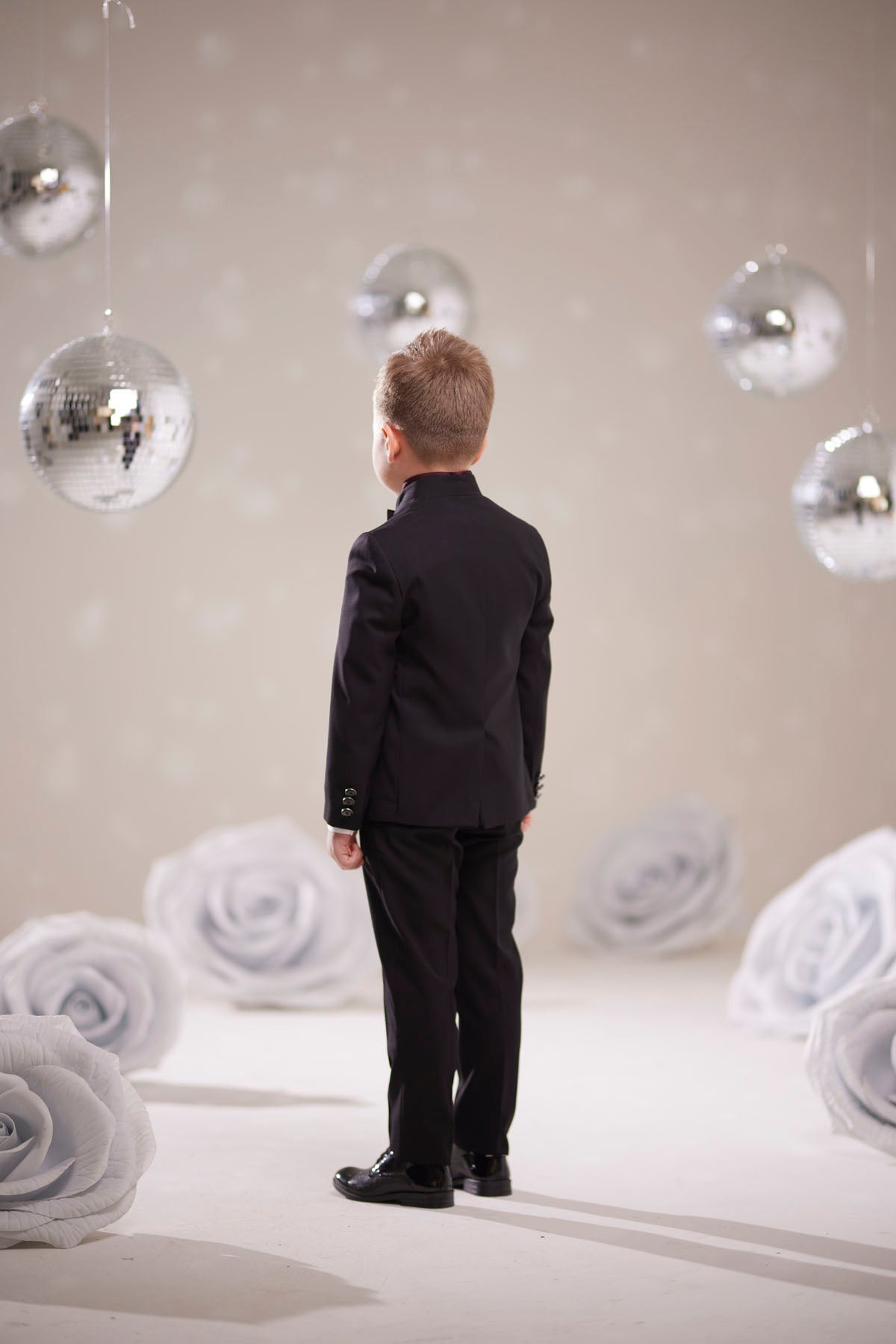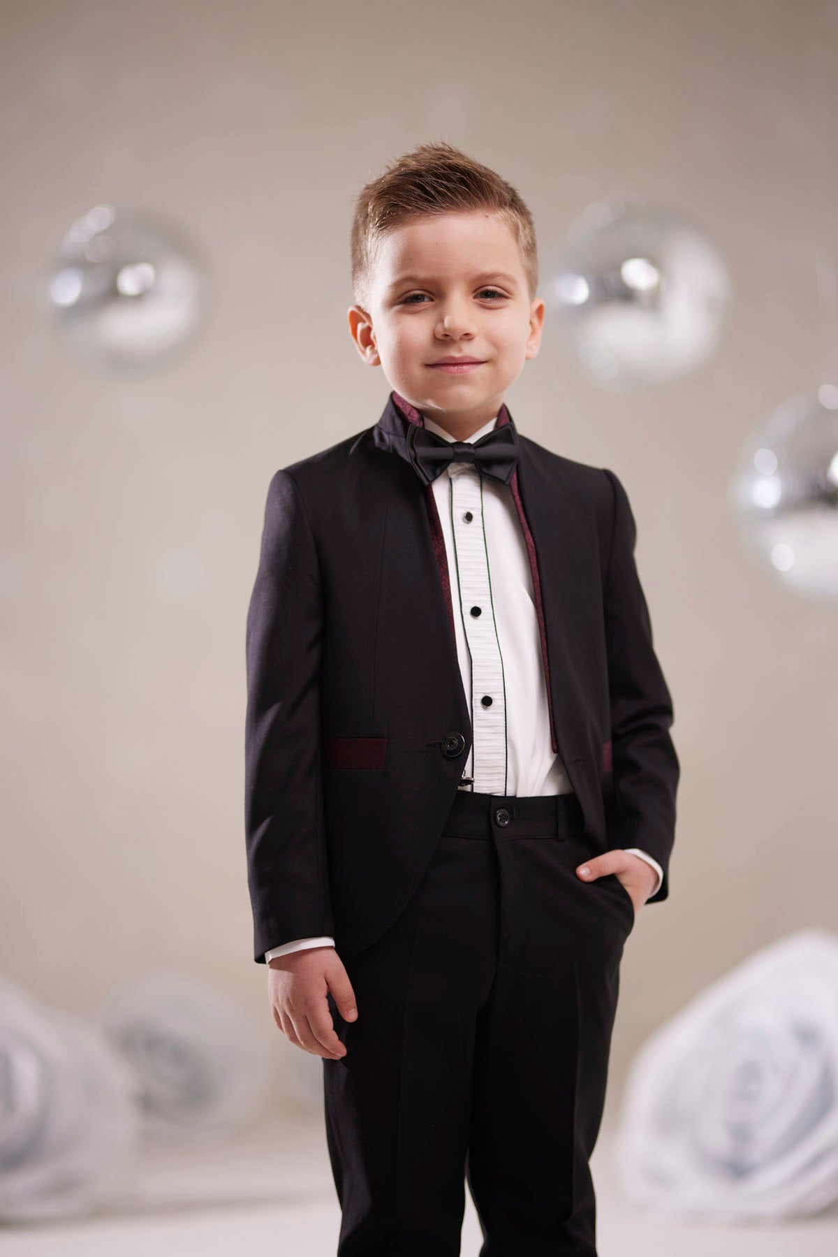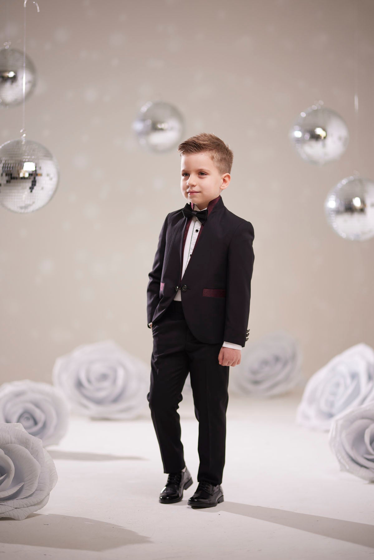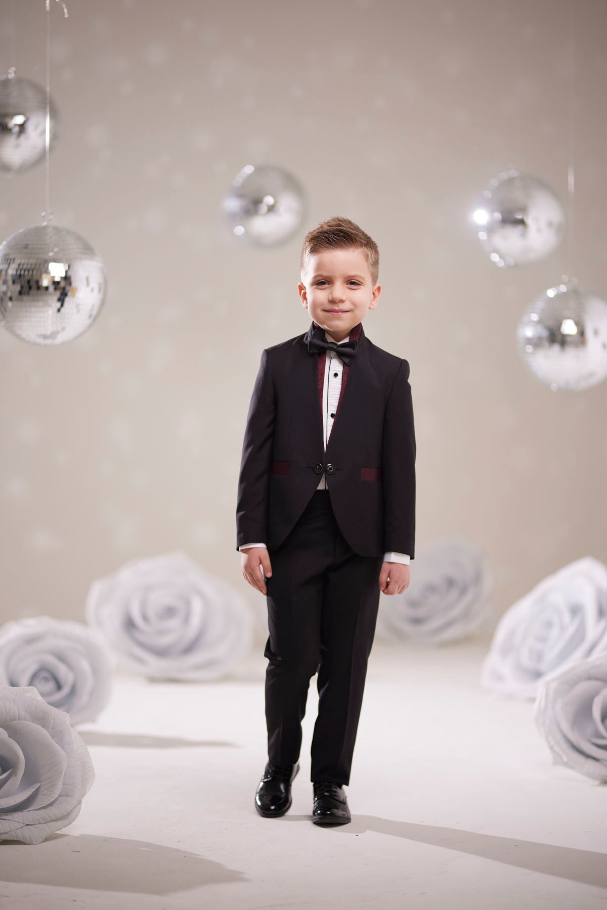 Minik beyefendiler için tasarlanmış bu siyah smokin takımı, şıklığı ve zarafeti bir araya getiriyor. Özel dikim görünümlü ceket, pileli beyaz gömlek ve papyon detayıyla klasik smokin stilini yansıtır. Parlak siyah ayakkabılarla kombinlendiğinde davet, düğün, mezuniyet gibi özel günlerde göz alıcı bir duruş sağlar.