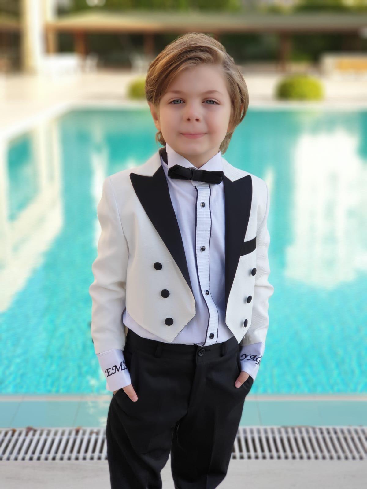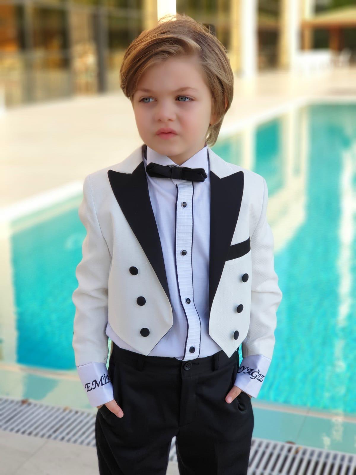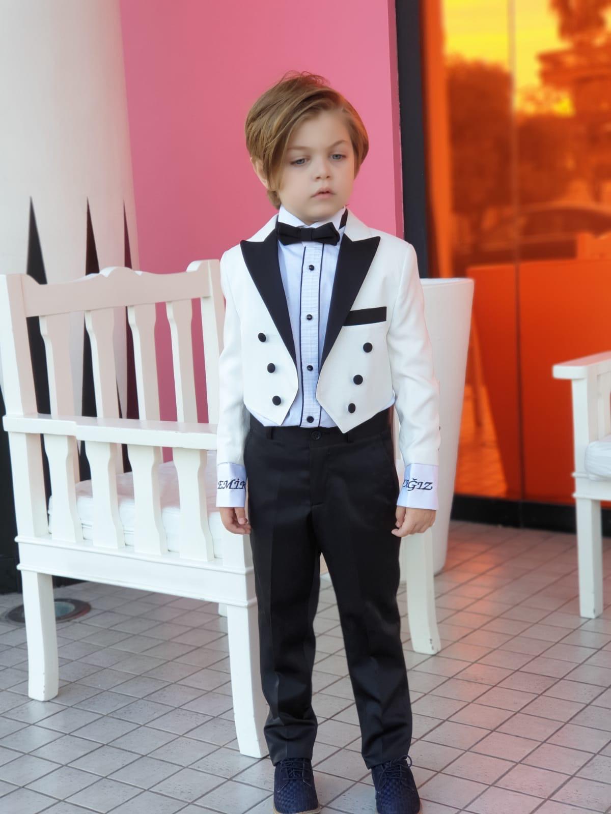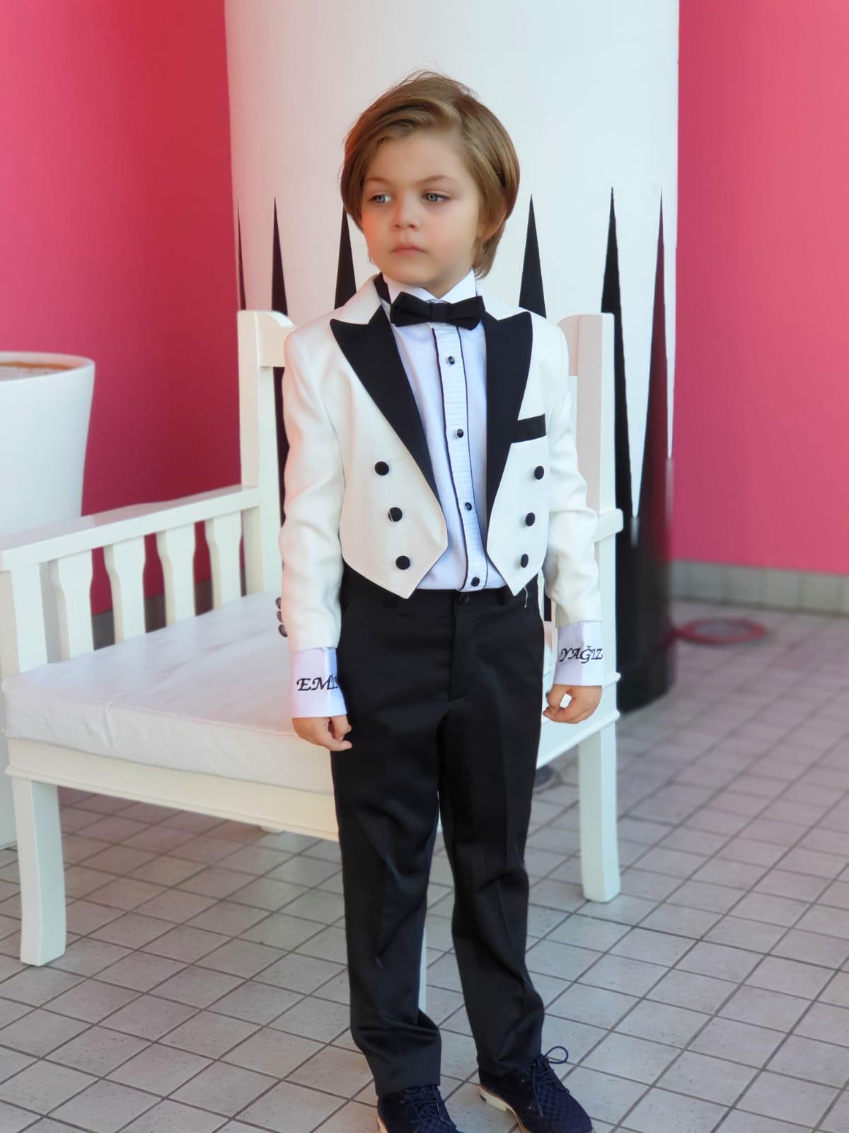 Minik beyefendiler için özel olarak tasarlanmış bu klasik erkek çocuk takım elbisesi, şıklığı ve zarafeti bir araya getiriyor. Özel dikim görünümüne sahip ceket, ütü izli şık pantolon, beyaz gömlek ve uyumlu papyon kombinasyonuyla klasik takım elbise stilini yansıtır. Zarif dikiş detayları ve kaliteli kumaşı ile düğün, sünnet, mezuniyet, özel davet gibi en özel günlerde çocuğunuzun göz alıcı bir duruş sergilemesini sağlar.
