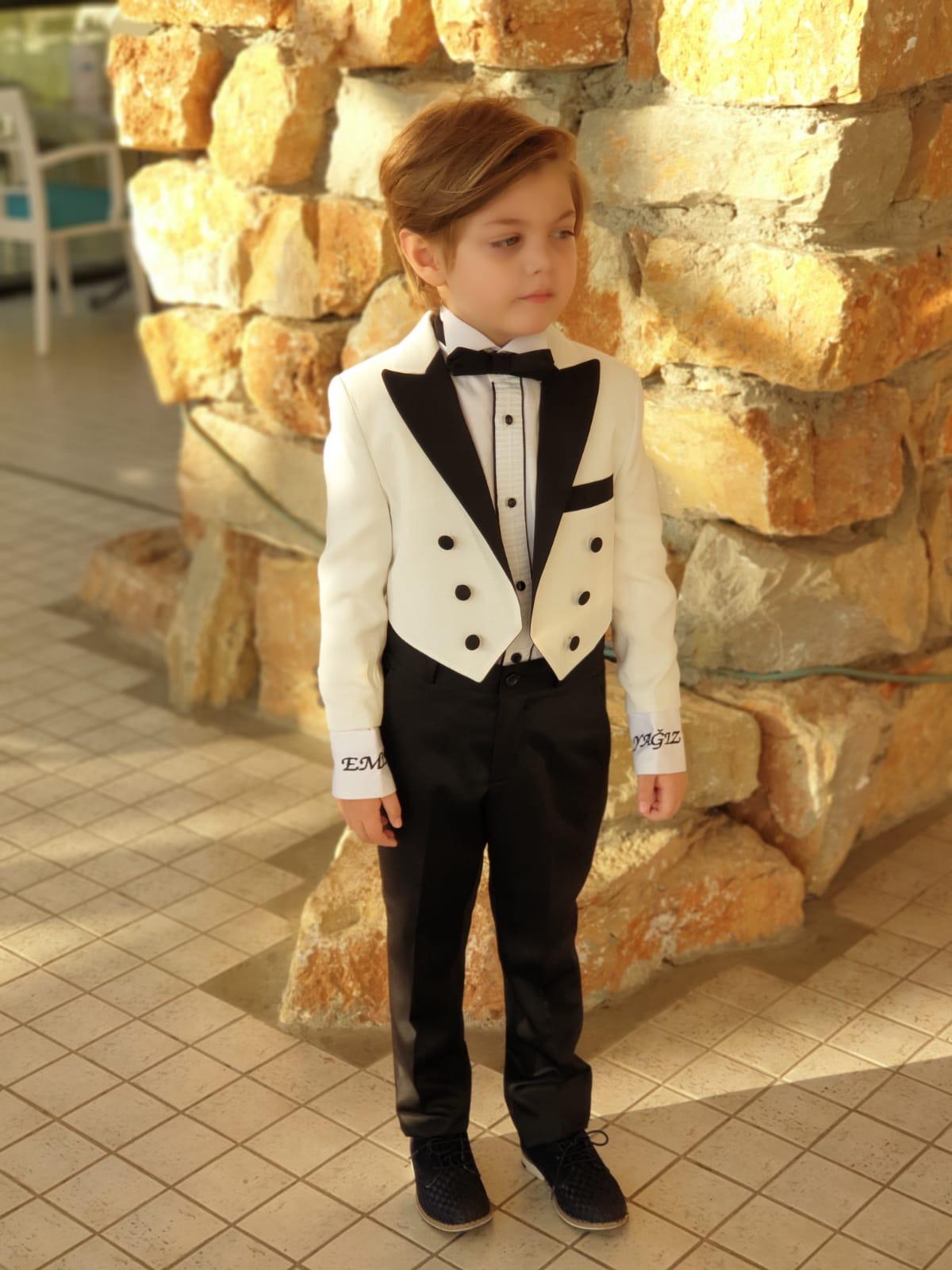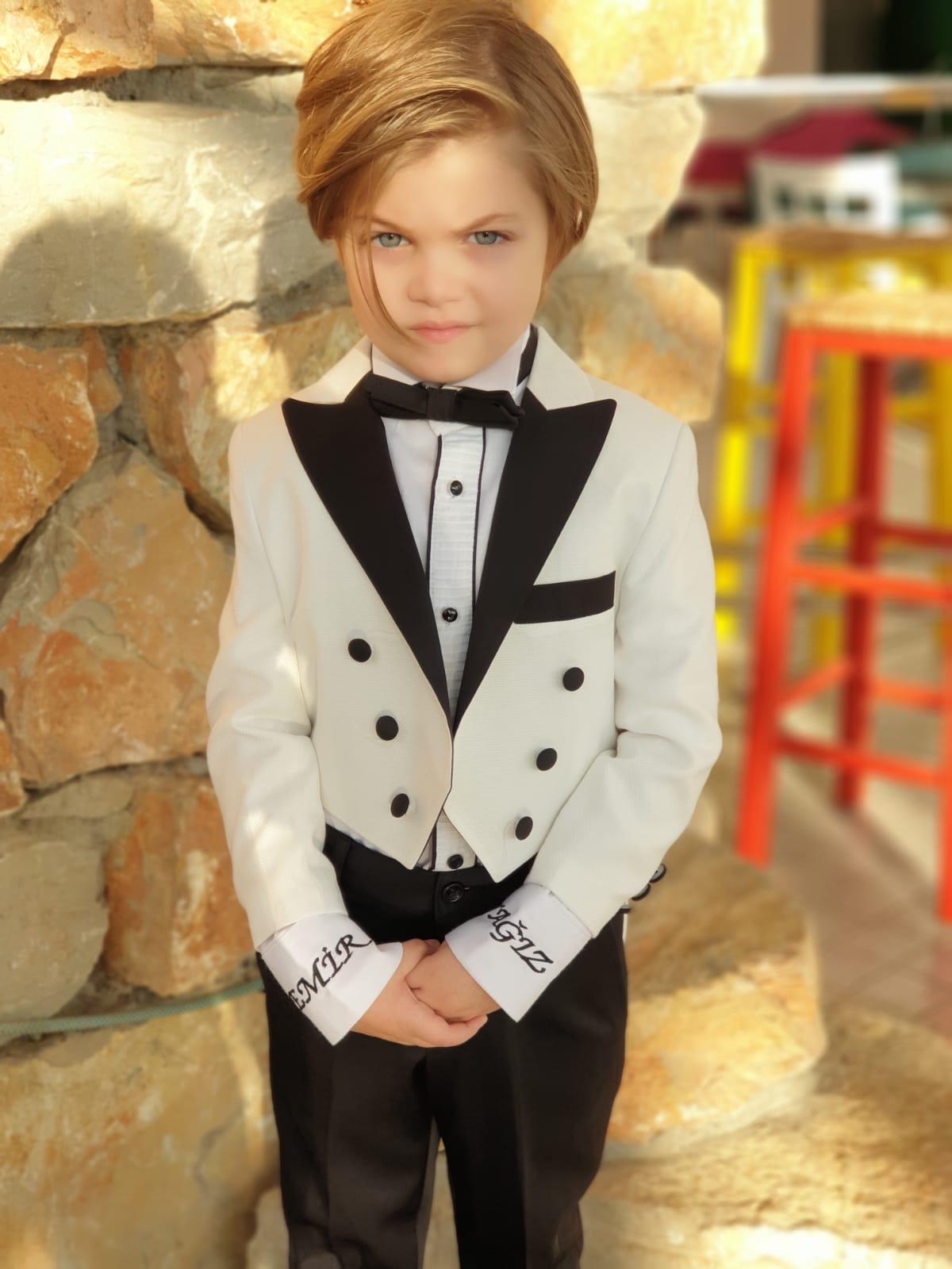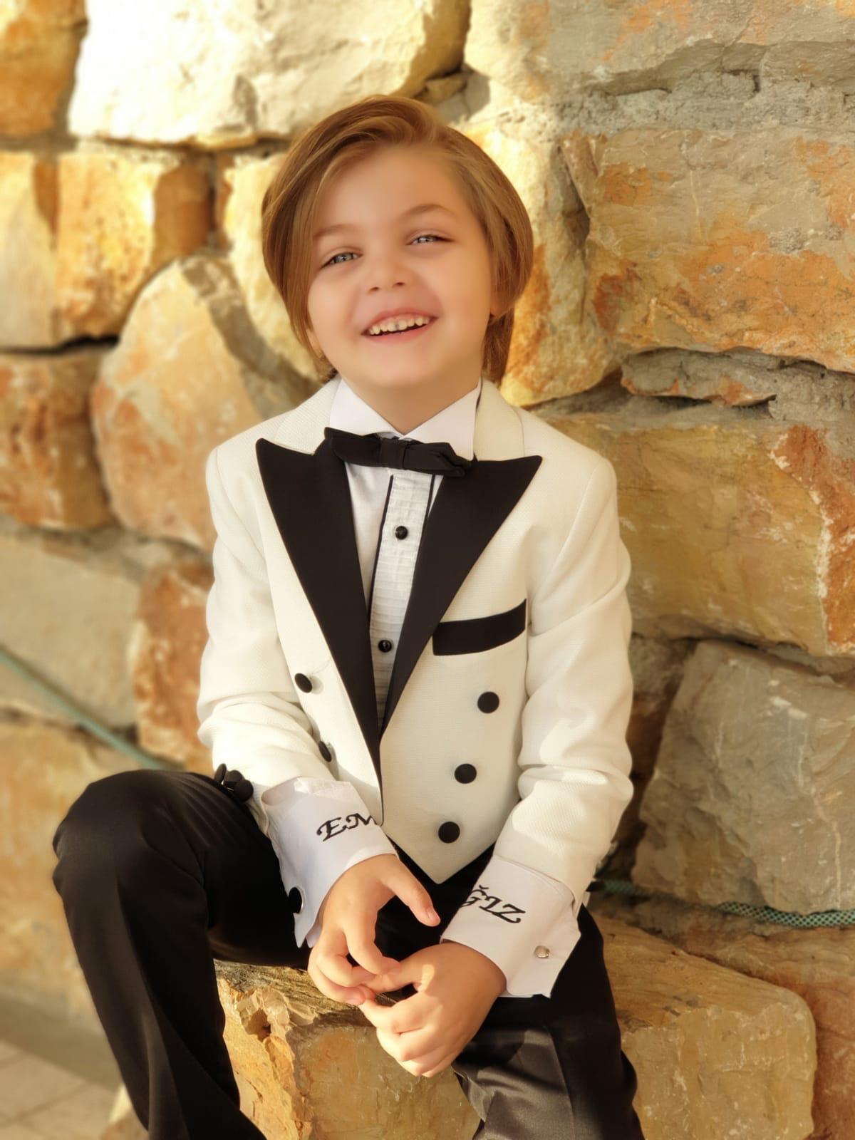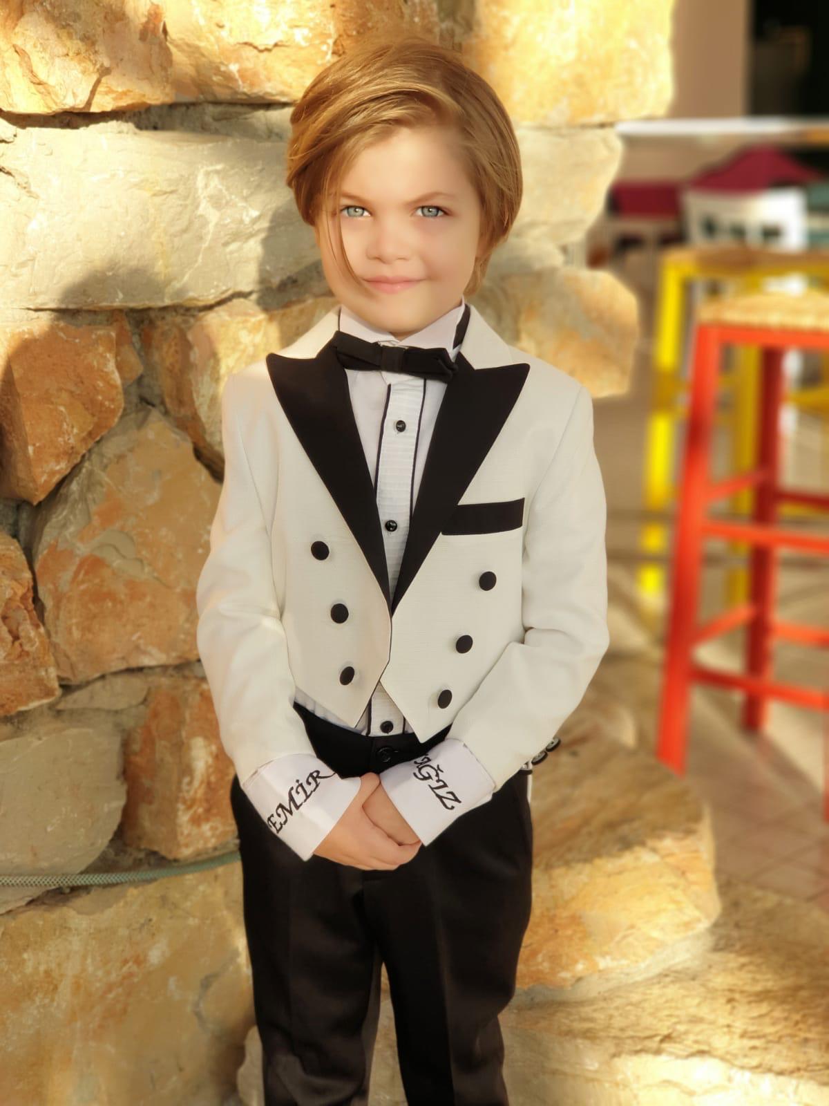 Minik beyefendiler için özel olarak tasarlanmış bu klasik erkek çocuk takım elbisesi, şıklığı ve zarafeti bir araya getiriyor. Özel dikim görünümüne sahip ceket, ütü izli şık pantolon, beyaz gömlek ve uyumlu papyon kombinasyonuyla klasik takım elbise stilini yansıtır. Zarif dikiş detayları ve kaliteli kumaşı ile düğün, sünnet, mezuniyet, özel davet gibi en özel günlerde çocuğunuzun göz alıcı bir duruş sergilemesini sağlar.