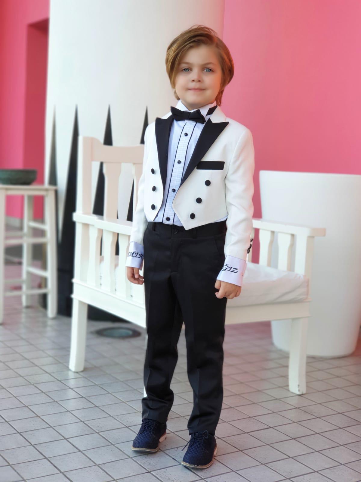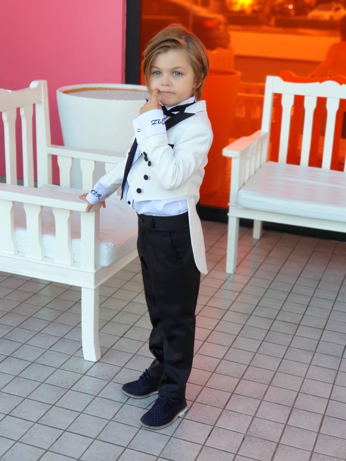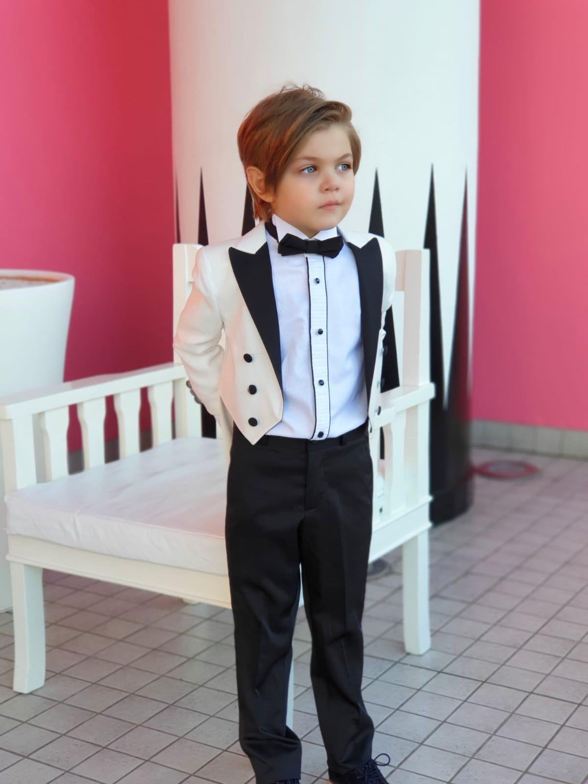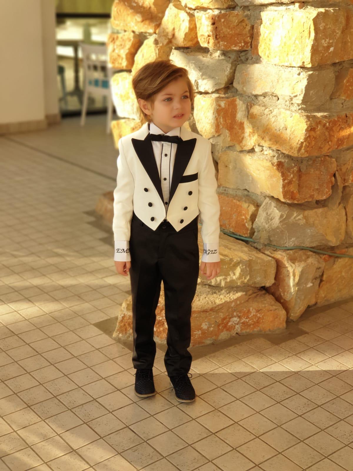 Minik beyefendiler için özel olarak tasarlanmış bu klasik erkek çocuk takım elbisesi, şıklığı ve zarafeti bir araya getiriyor. Özel dikim görünümüne sahip ceket, ütü izli şık pantolon, beyaz gömlek ve uyumlu papyon kombinasyonuyla klasik takım elbise stilini yansıtır. Zarif dikiş detayları ve kaliteli kumaşı ile düğün, sünnet, mezuniyet, özel davet gibi en özel günlerde çocuğunuzun göz alıcı bir duruş sergilemesini sağlar.