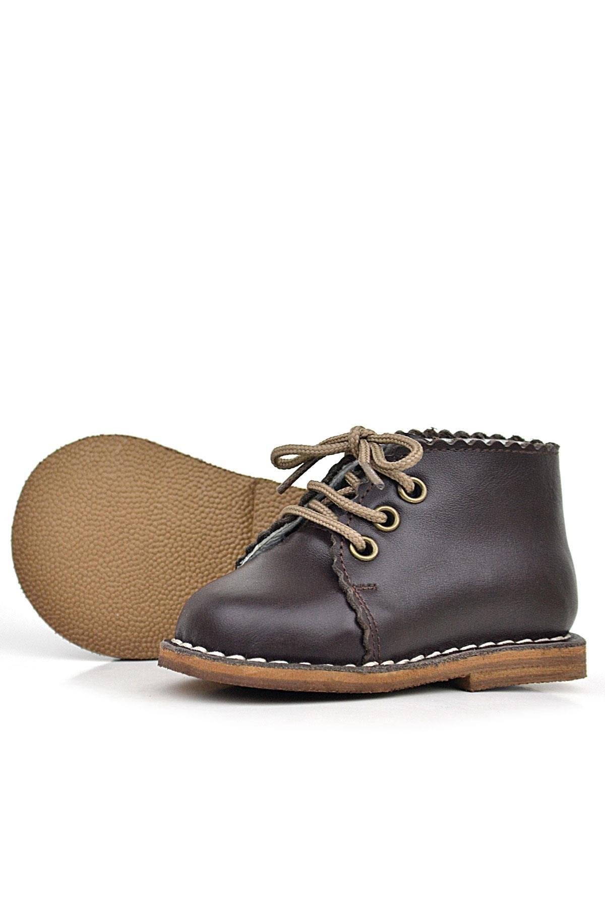 Minik adımlar için şıklık ve konforu bir arada sunan kahverengi hakiki deri bebek botu, el işçiliği ile özenle üretilmiştir. %100 gerçek deri yapısı sayesinde hem yumuşak hem de dayanıklıdır. Yuvarlak burun tasarımı bebeğinizin ayak parmaklarının rahat hareket etmesini sağlar.