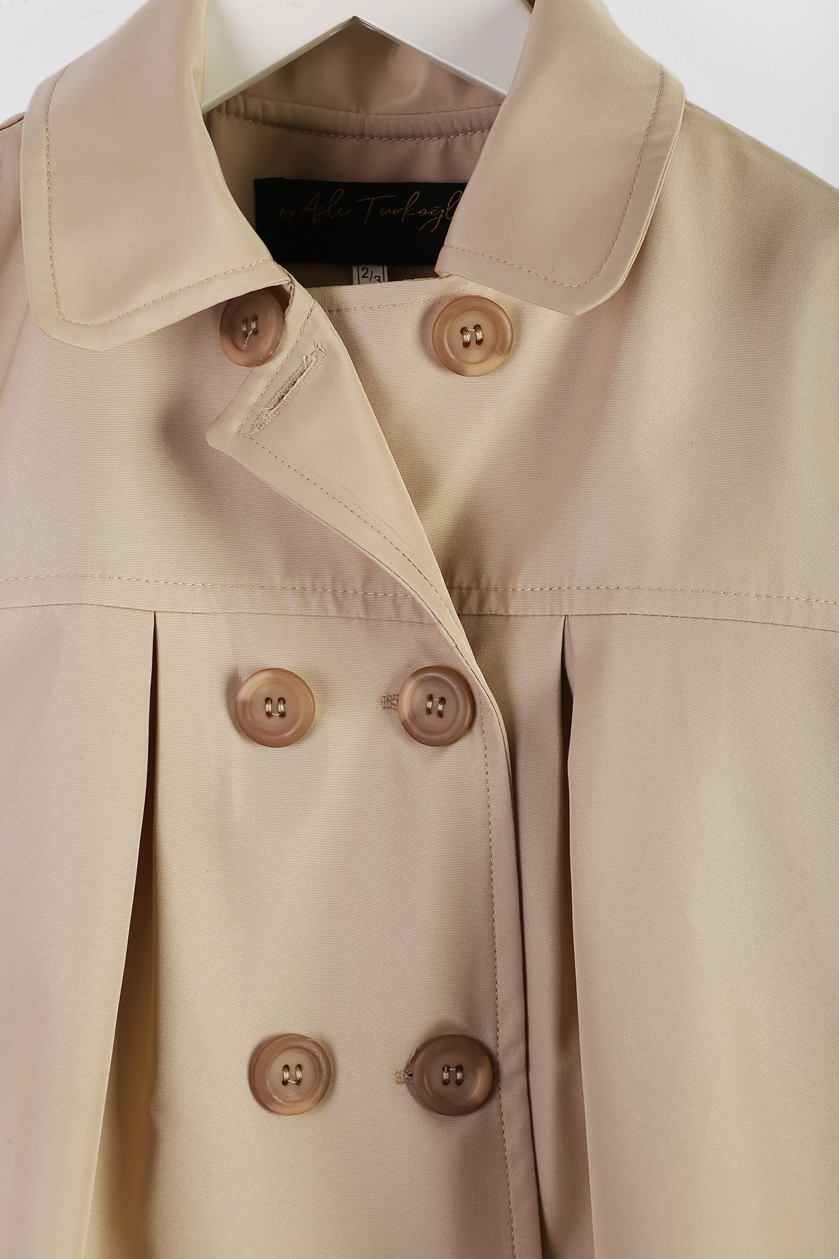 Hem günlük kullanım hem de özel günler için şık ve fonksiyonel bir dış giyim parçası. Yumuşak dokulu, dayanıklı kumaşı ve rahat kesimi ile bahar ve sonbahar aylarında ideal. Zarif açık bej rengi, nötr tonuyla her kombine uyum sağlar. Çift düğmeli tasarımı ve bel kuşağı detayıyla modern bir görünüm sunar.