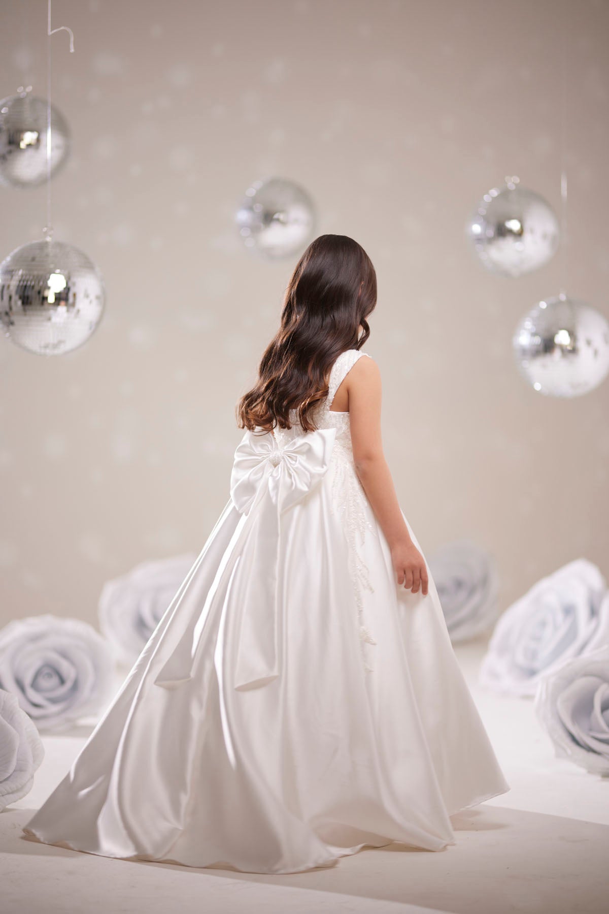 Arka kısmında büyük bir fiyonk detayı bulunur. Yüksek kaliteli saten kumaşı yumuşak dokulu astarla desteklenmiş, çocukların rahat hareket etmesi için geniş etek formuyla tamamlanmıştır.