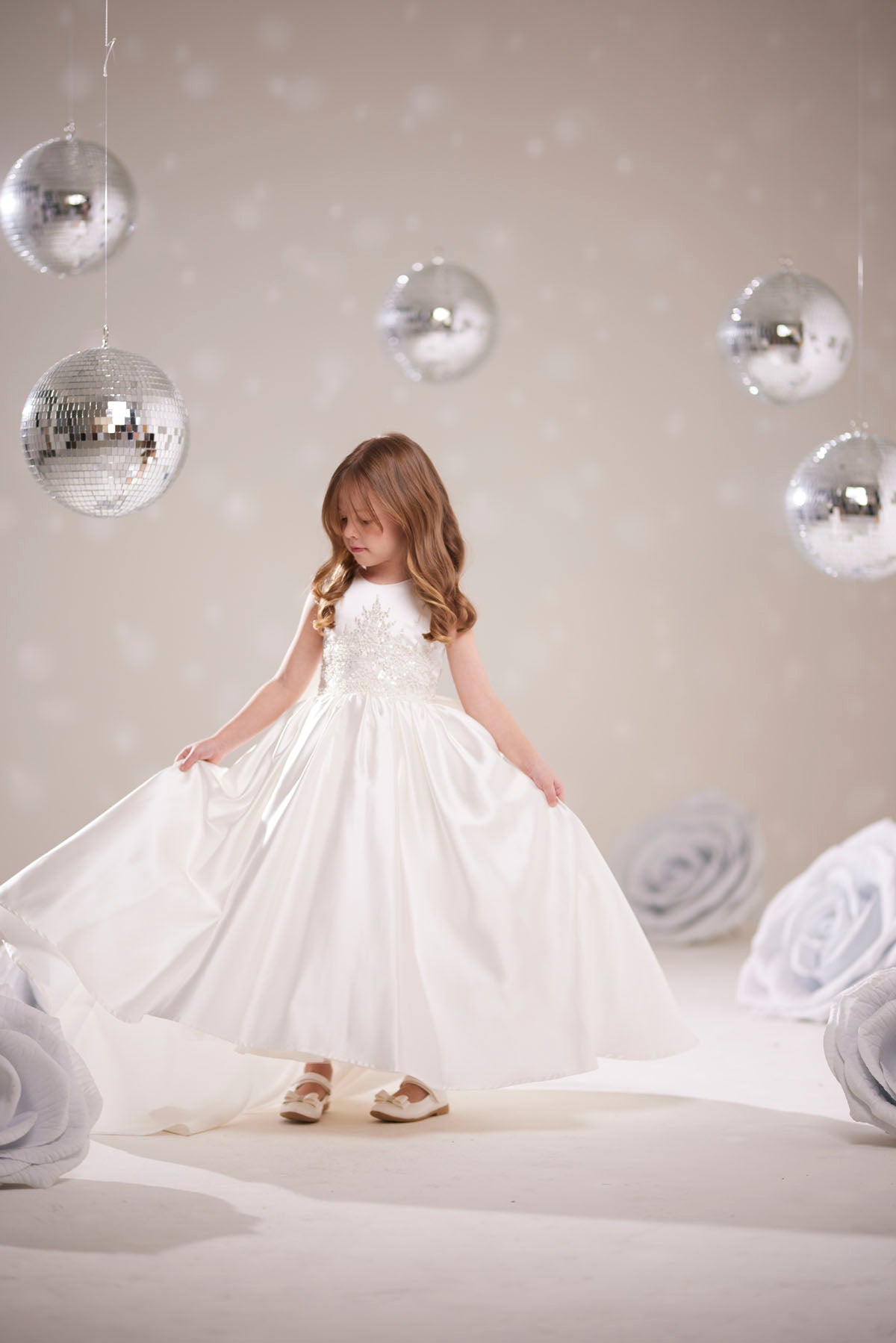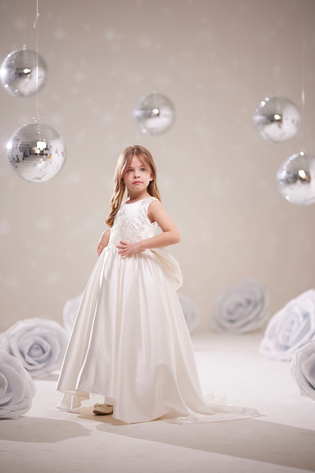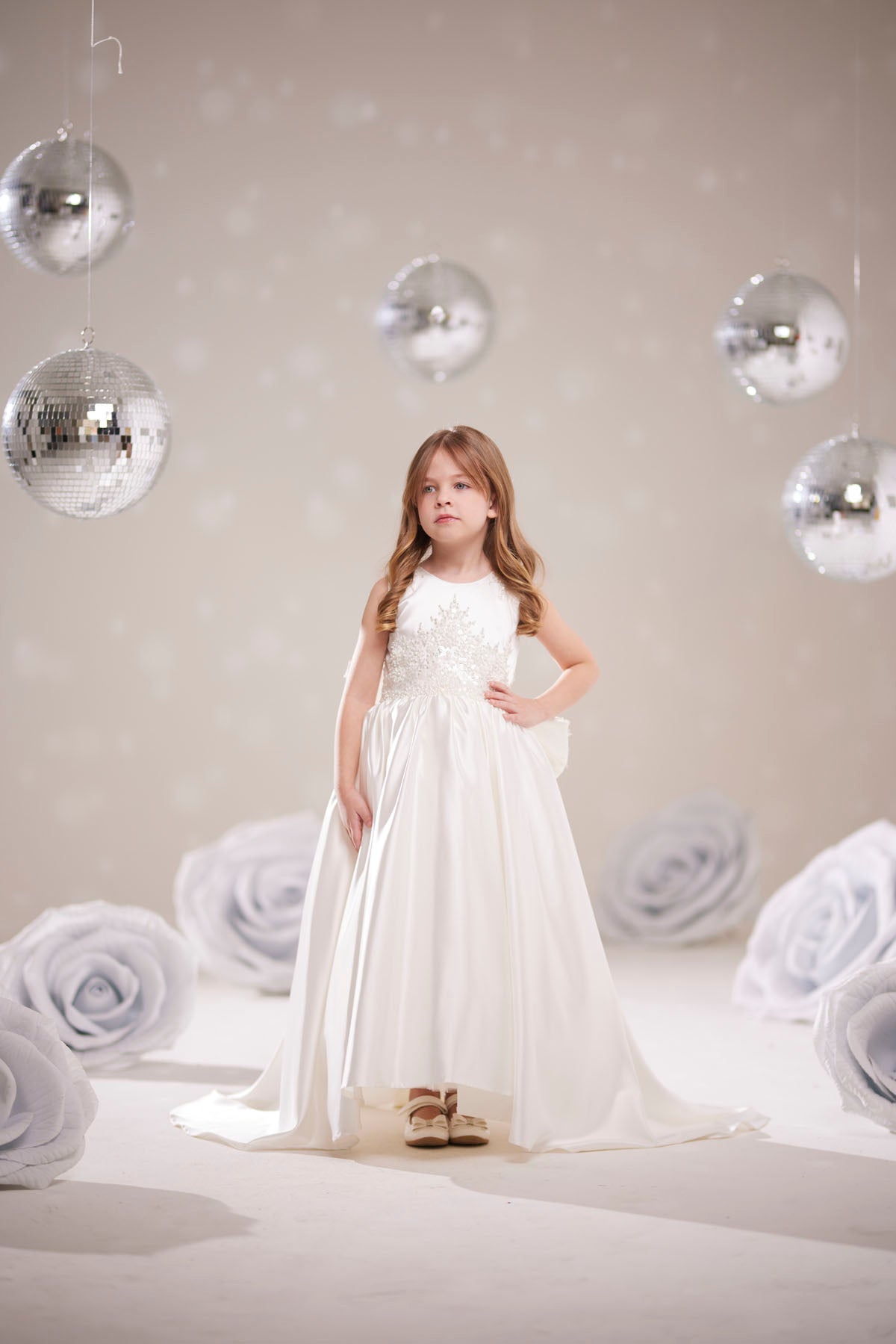 Kızınızın özel günlerinde ışıltıdaması için tasarlanmış bu beyaz prenses elbise, detayları ve zarif tasarımıyla dikkat çekiyor.