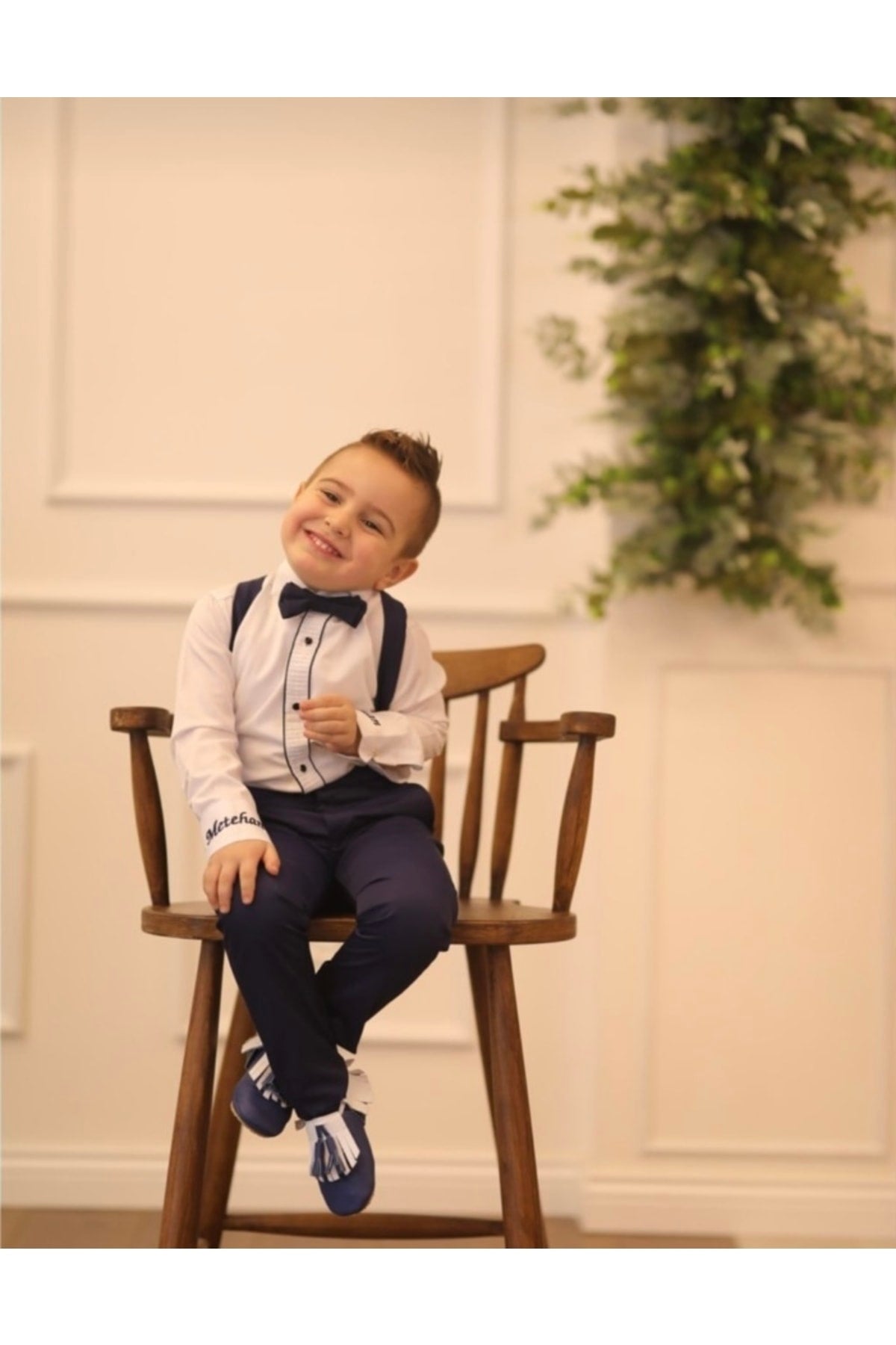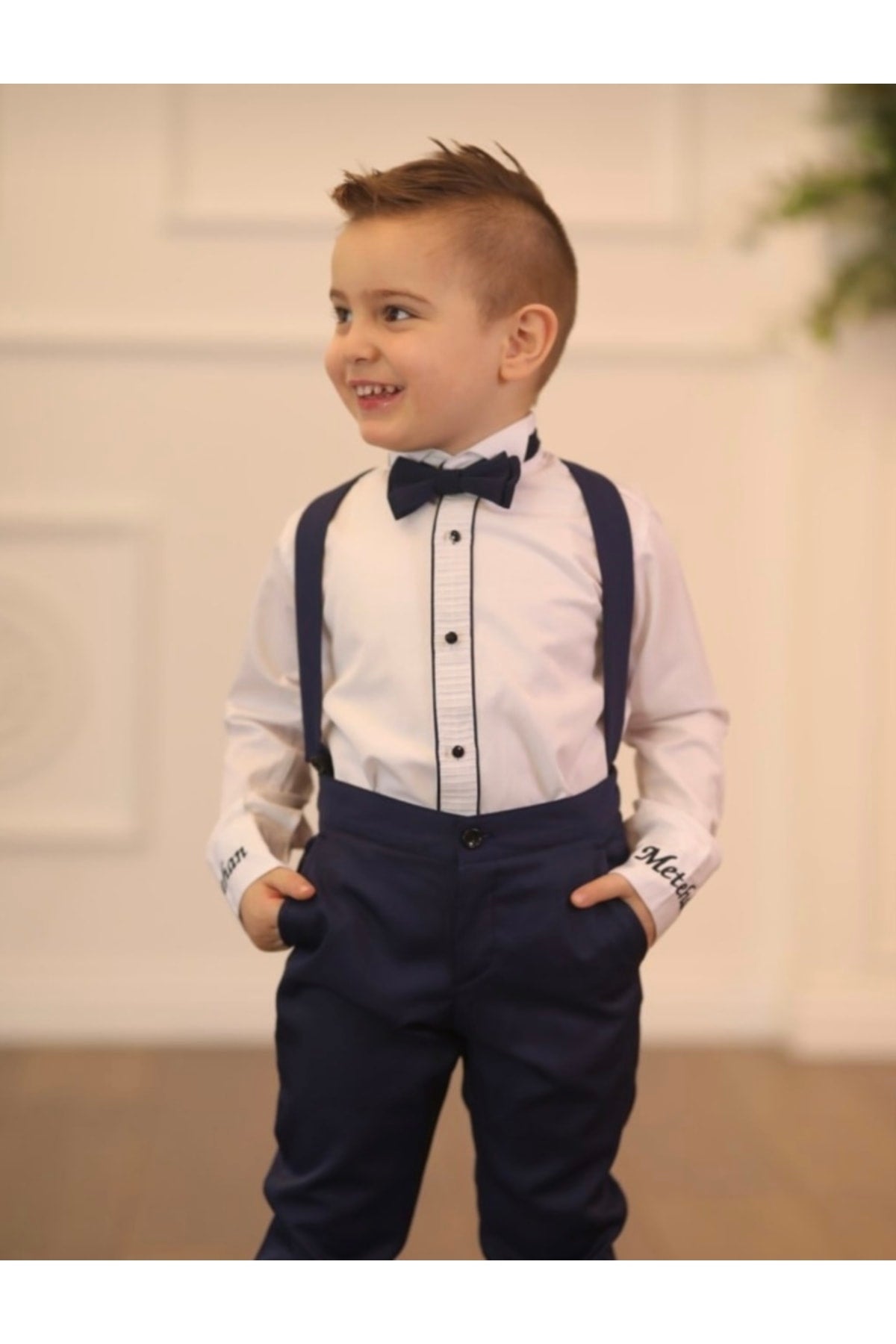 Bu zarif 3 parçalı erkek çocuk takımı; beyaz gömlek, lacivert pantolon, askı ve papyondan oluşur.