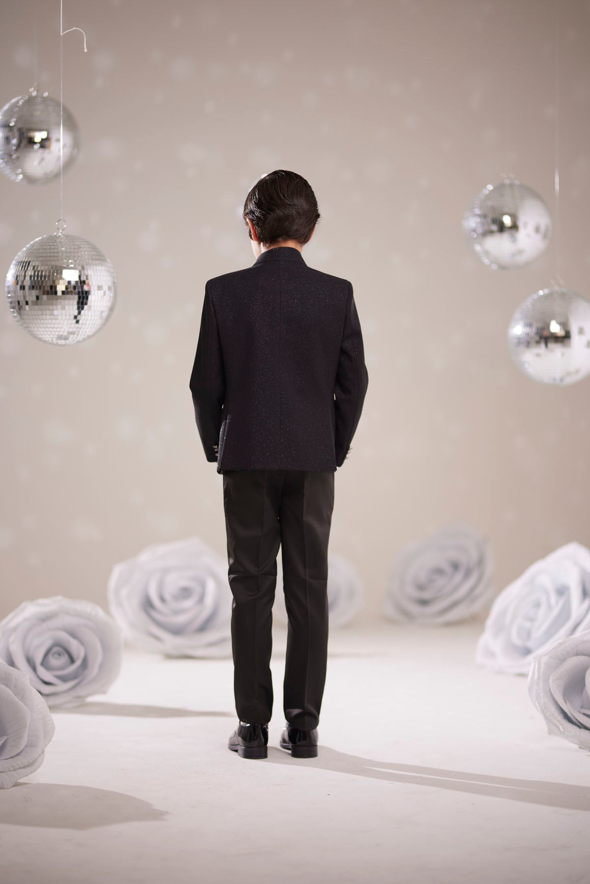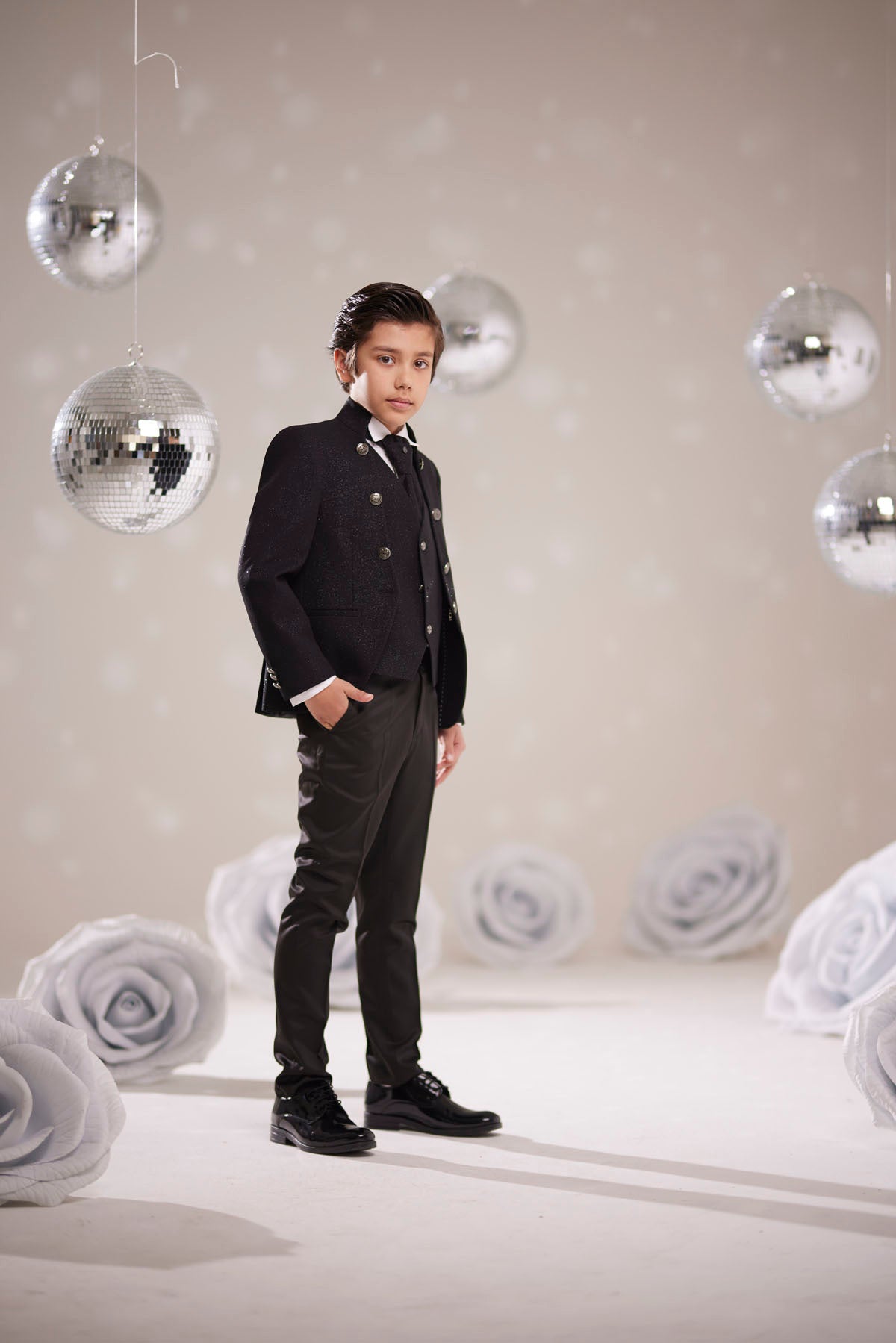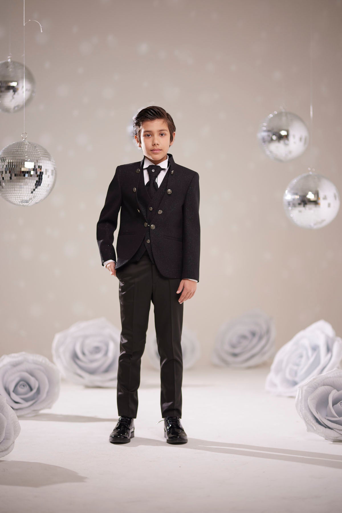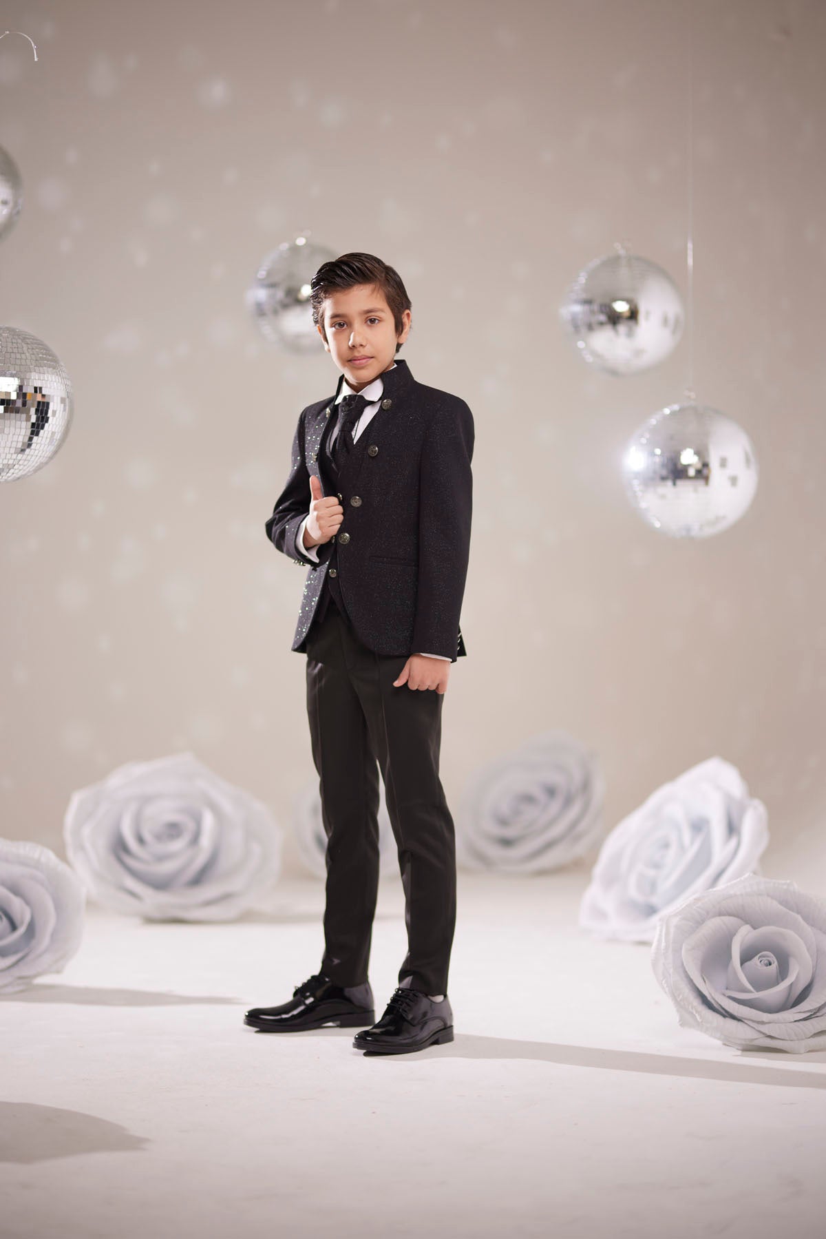 Simli Siyah Çocuk Takım Elbise – İtalyan Kesim Mezuniyet ve Özel Gün Kıyafeti