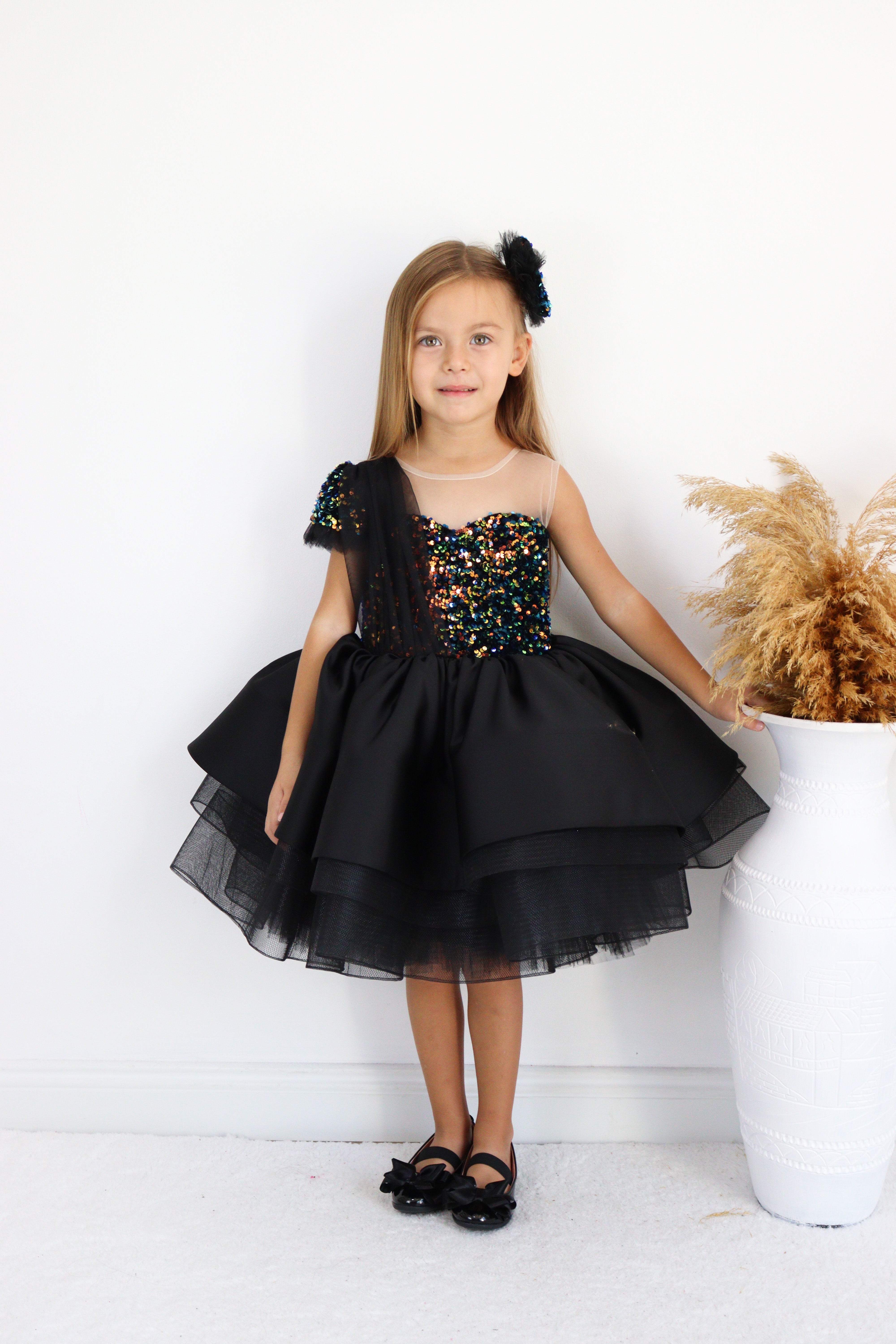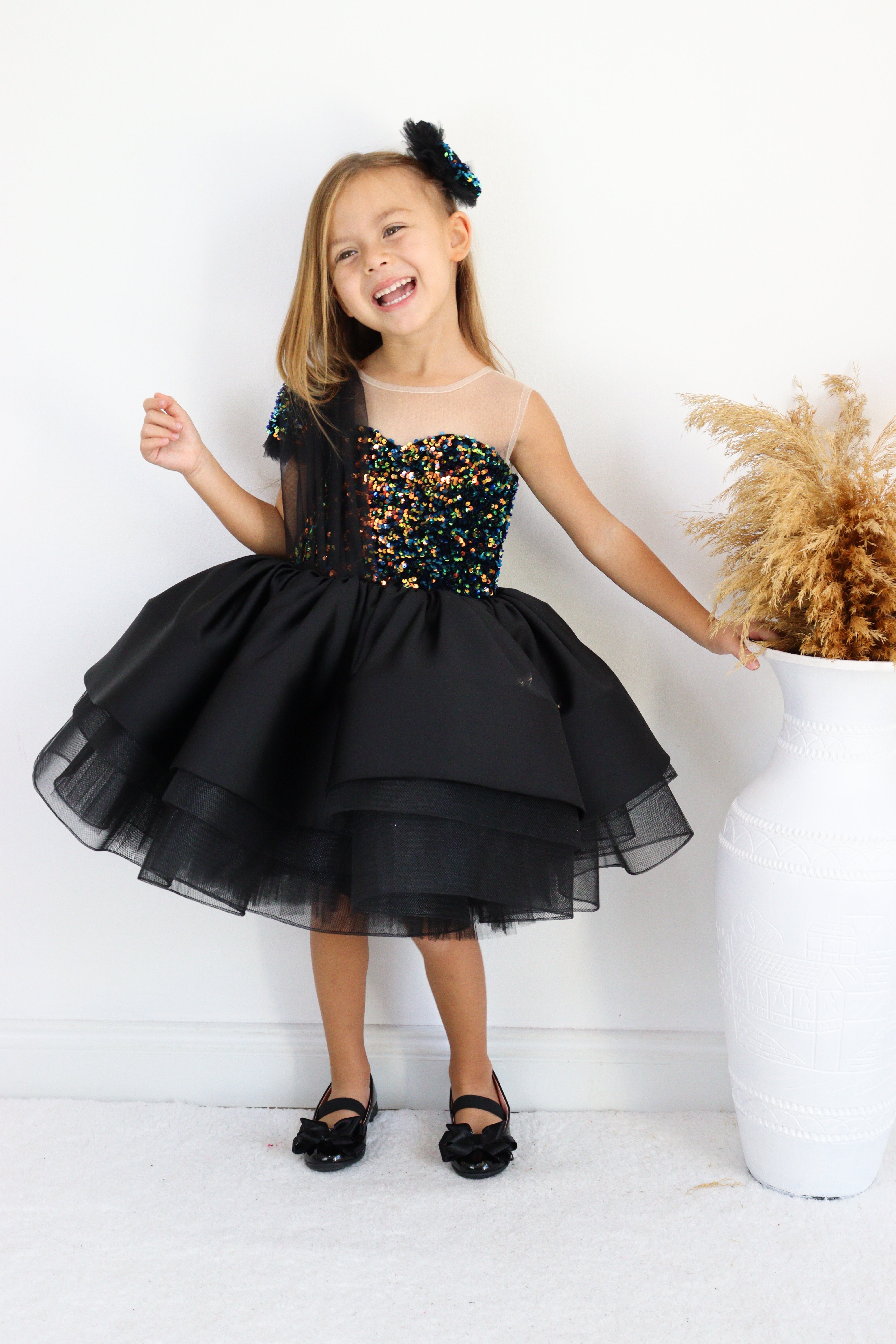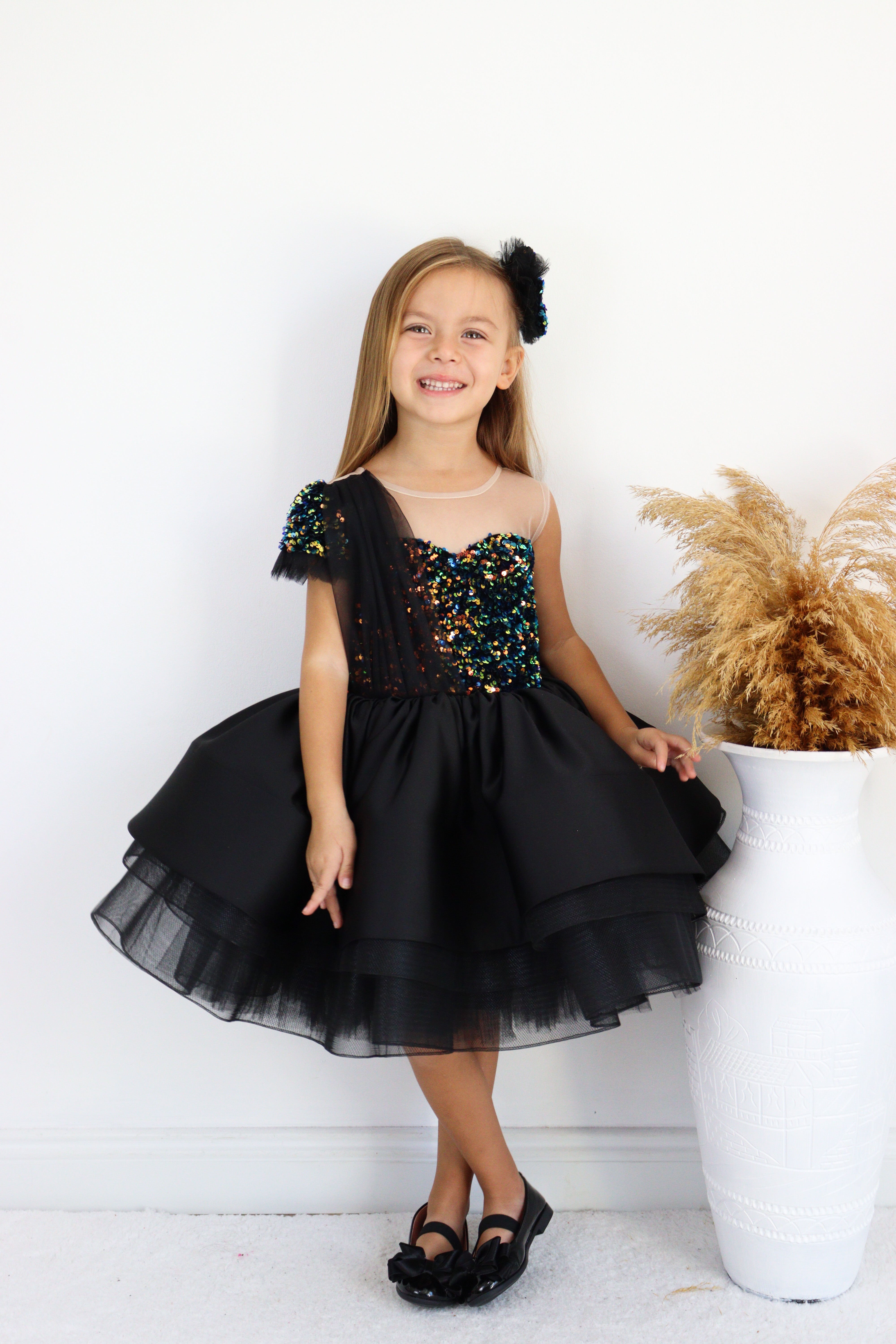 Küçük stil ikonları için tasarlanmış bu siyah prenses elbisesi, zarafet ve ışıltıyı bir araya getiriyor. Göğüs kısmında yer alan renkli pul işlemeler ve asimetrik tek omuz tül detayıyla dikkat çeken bu model, hacimli kat kat etek yapısı sayesinde adeta bir masal karakterini andırıyor. İç kısmındaki yumuşak astarı ve hafif yapısı sayesinde çocukların rahat etmesi için ideal. Doğum günü partileri, düğünler, yılbaşı geceleri ve sahne gösterileri için kusursuz bir tercih!