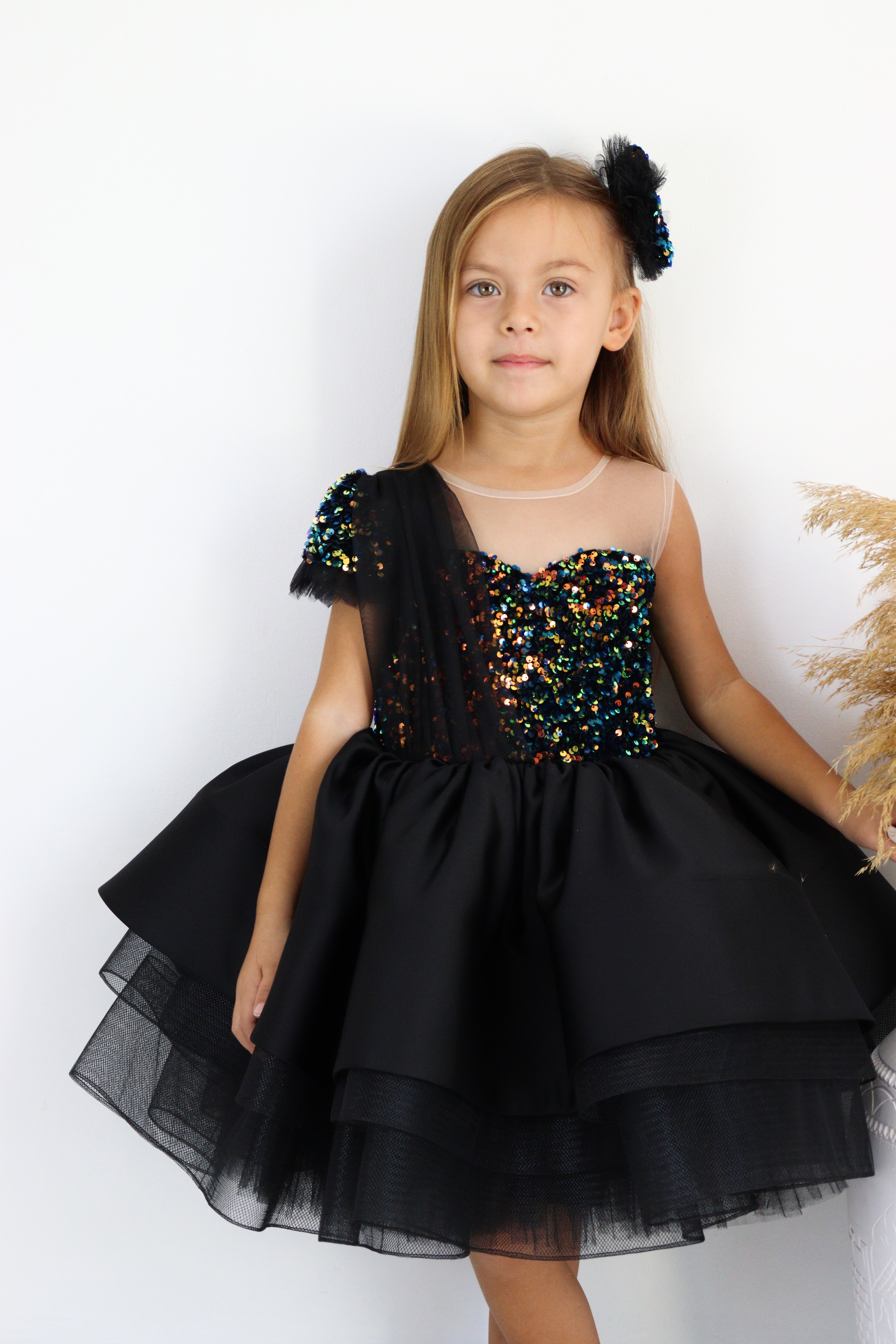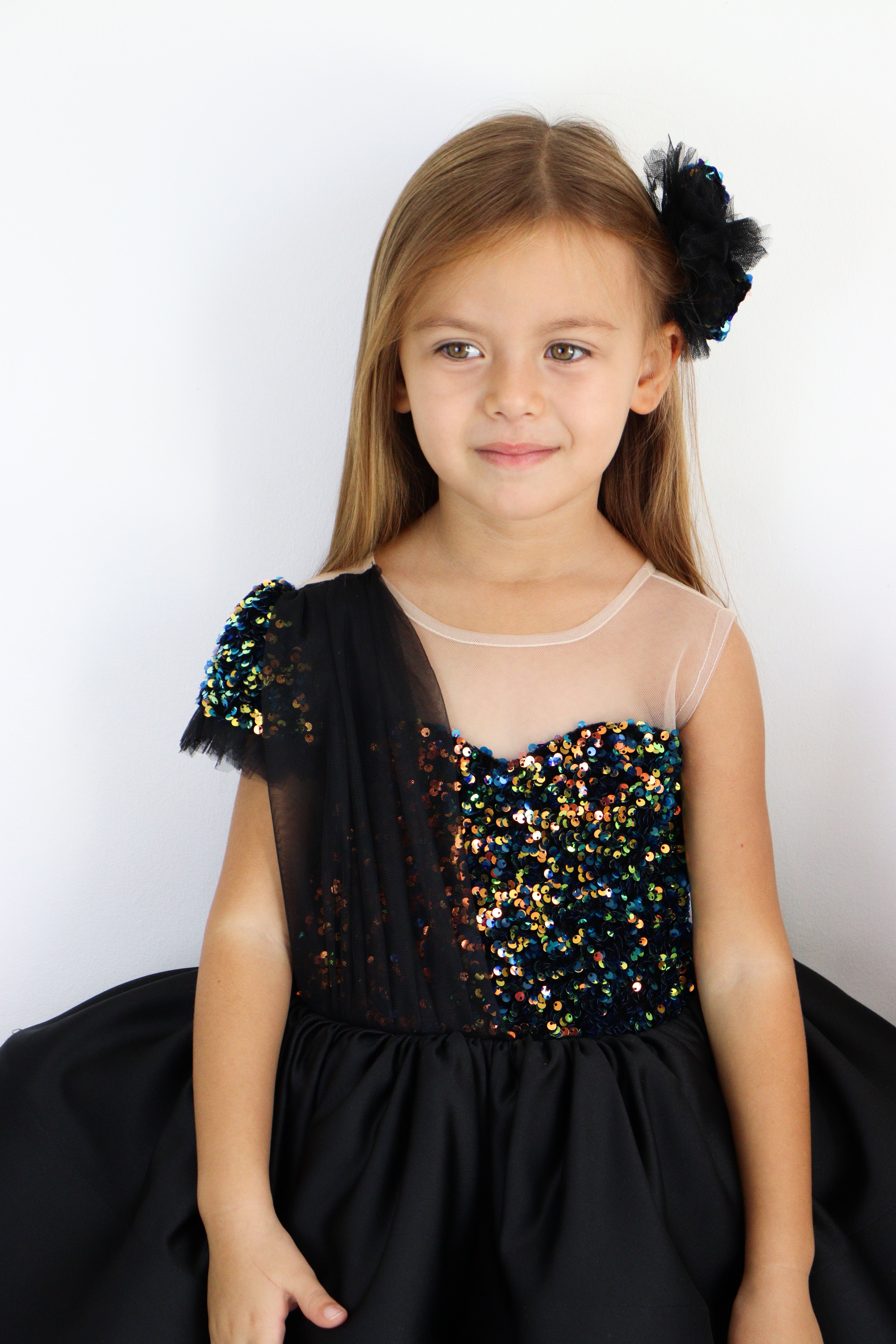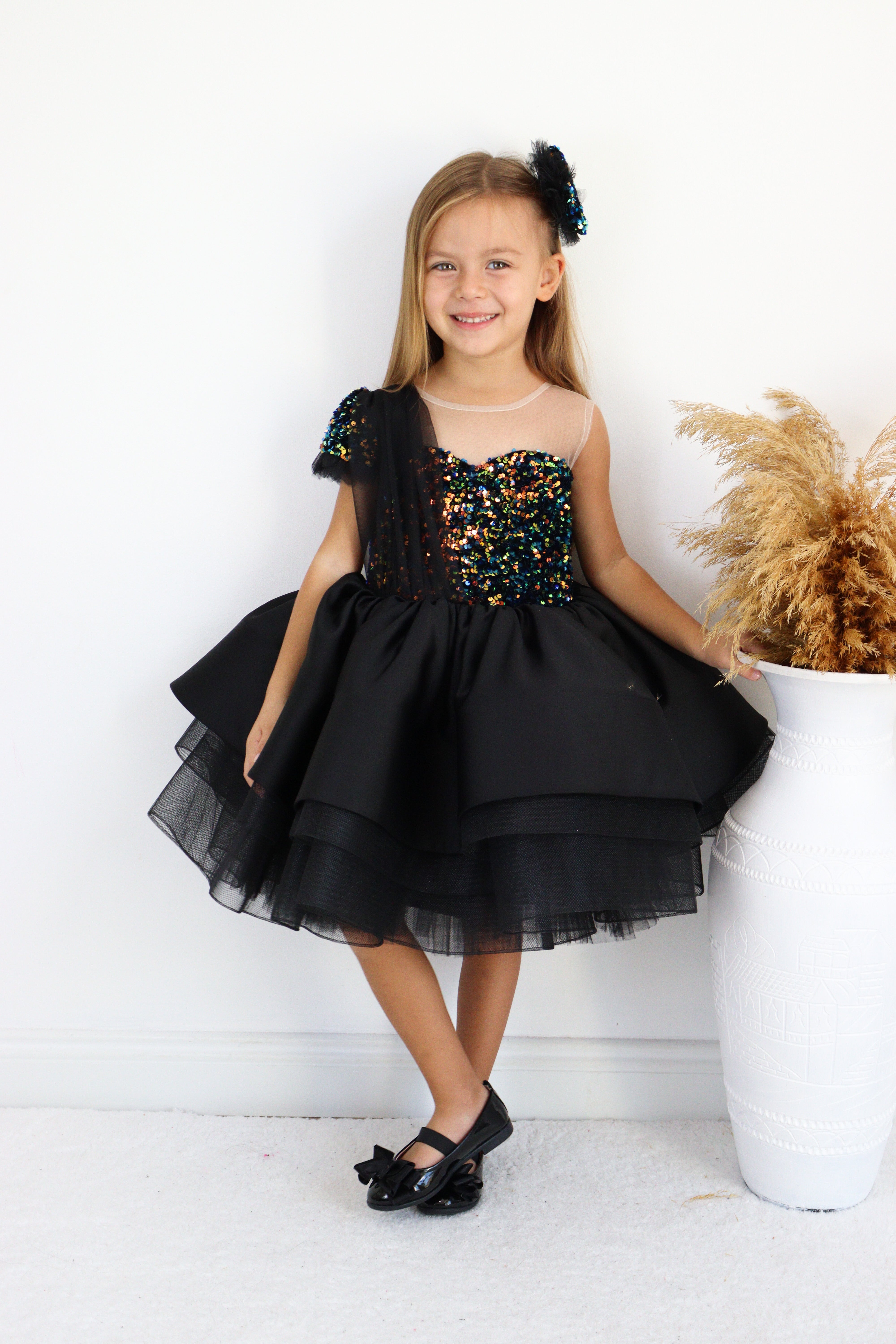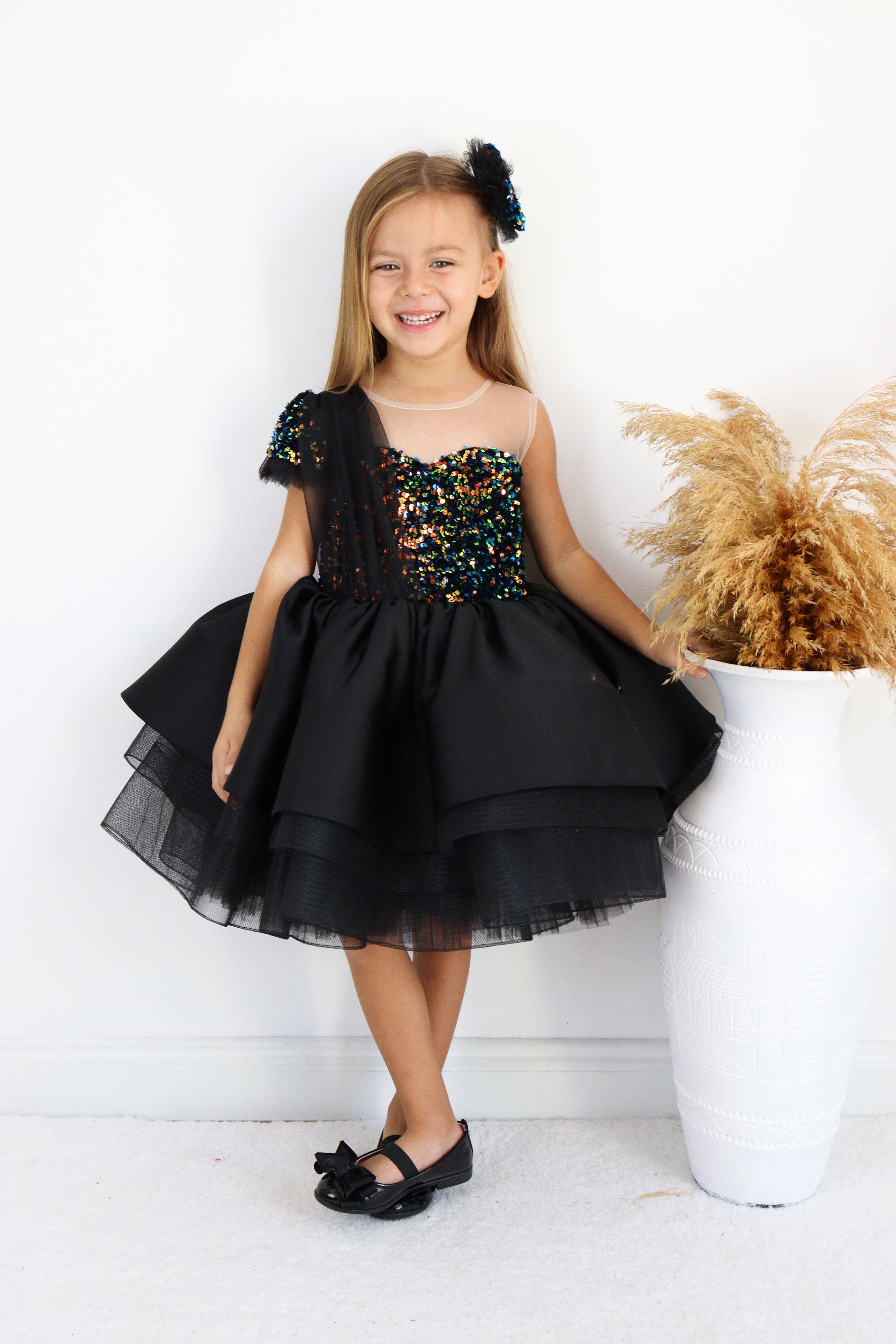 Küçük stil ikonları için tasarlanmış bu siyah prenses elbisesi, zarafet ve ışıltıyı bir araya getiriyor. Göğüs kısmında yer alan renkli pul işlemeler ve asimetrik tek omuz tül detayıyla dikkat çeken bu model, hacimli kat kat etek yapısı sayesinde adeta bir masal karakterini andırıyor. İç kısmındaki yumuşak astarı ve hafif yapısı sayesinde çocukların rahat etmesi için ideal. Doğum günü partileri, düğünler, yılbaşı geceleri ve sahne gösterileri için kusursuz bir tercih!