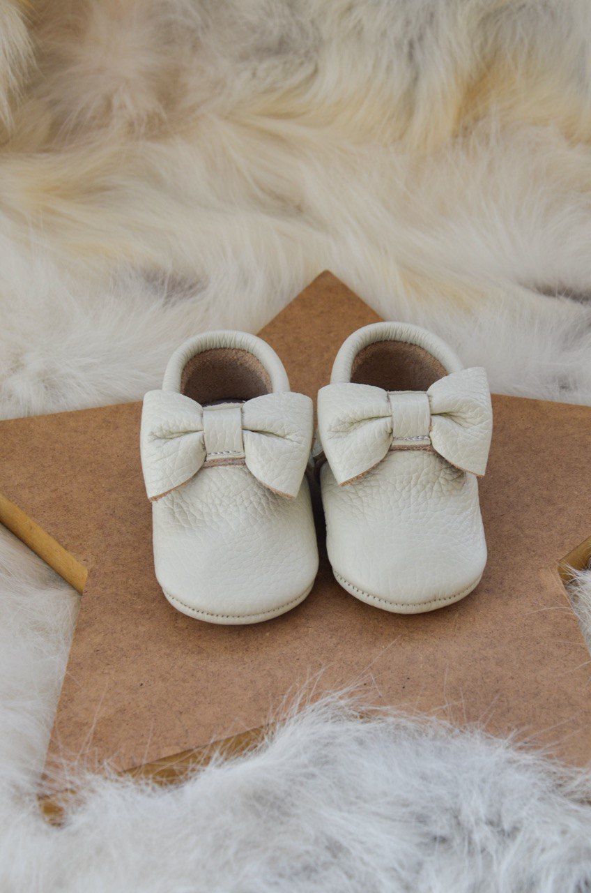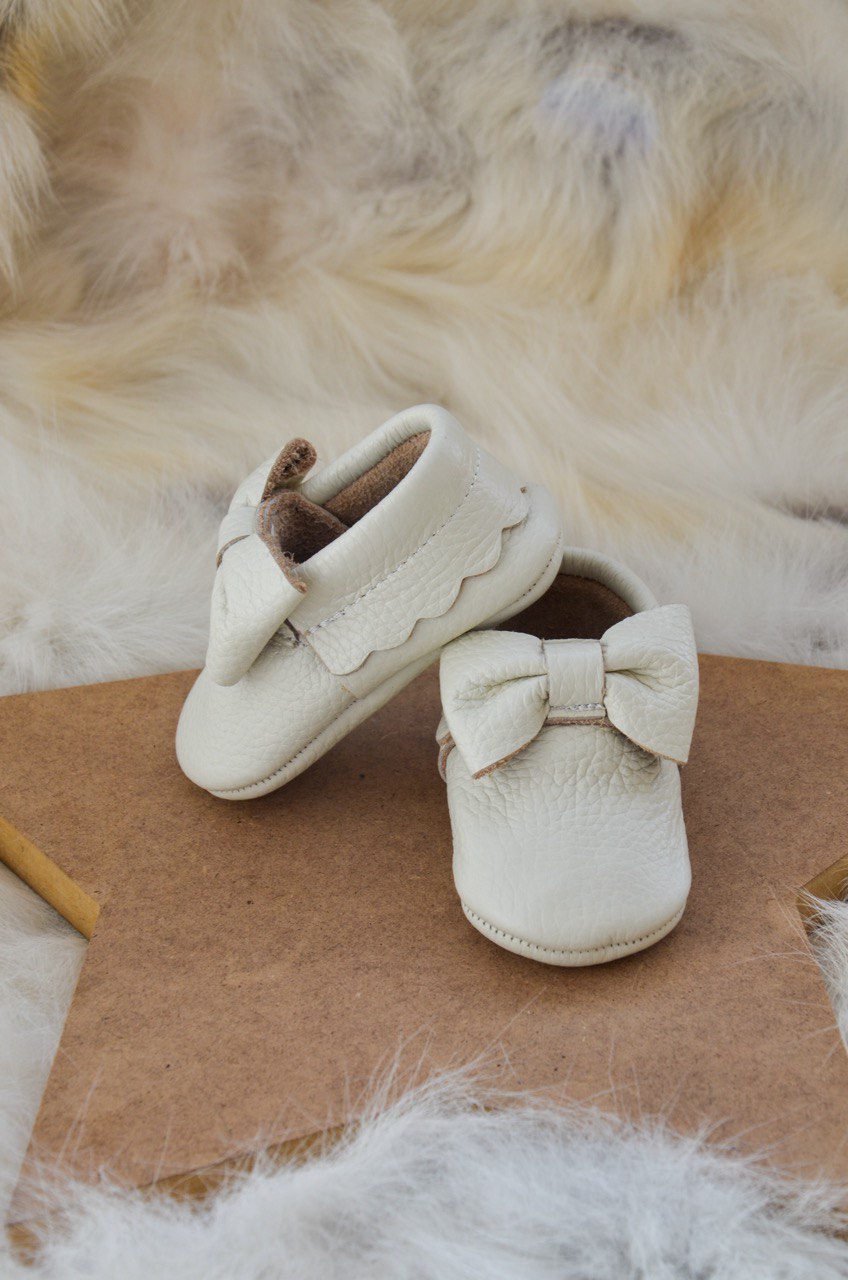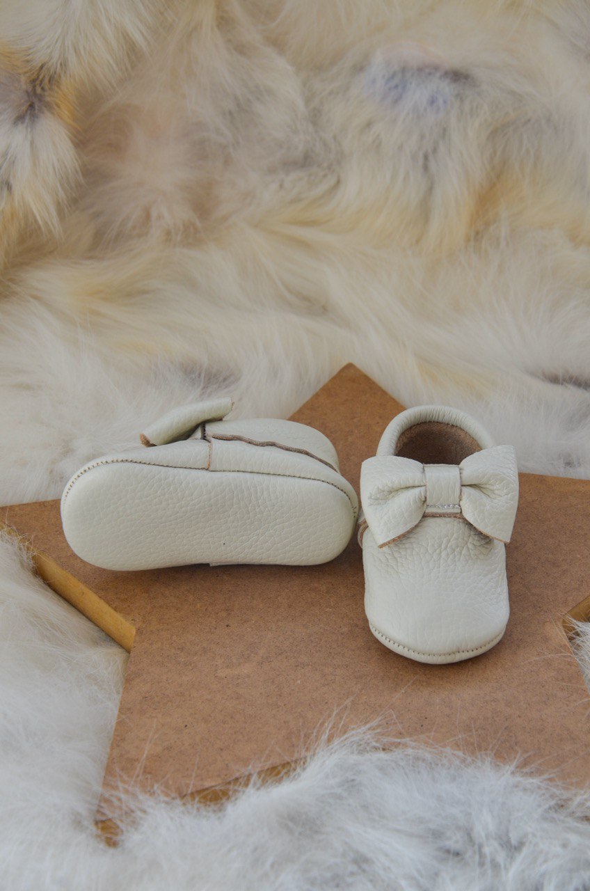 Bu el yapımı krem rengi bebek patikler, %100 hakiki yumuşak deriden üretilmiştir. El işçiliğiyle dikilen fiyonk detayı ve zarif kesimleriyle sade ama çok şık bir görünüme sahiptir.