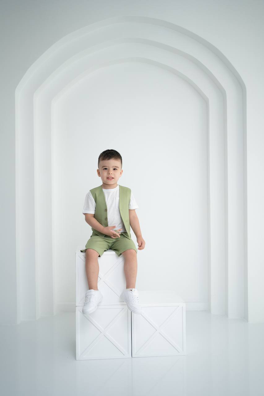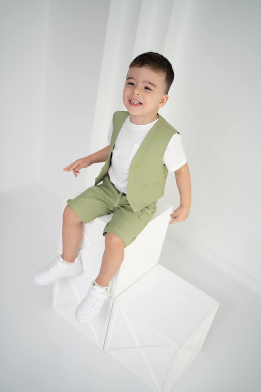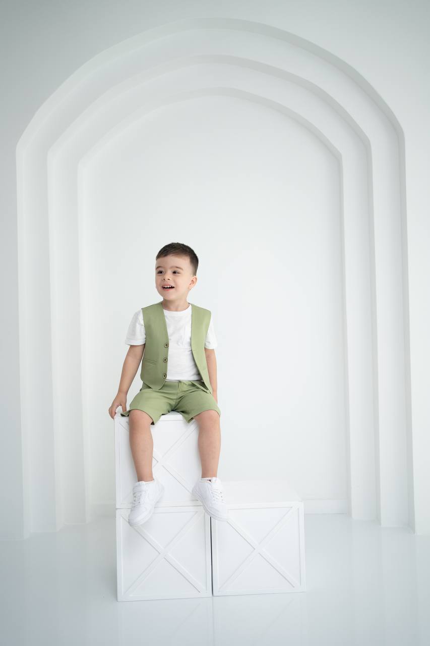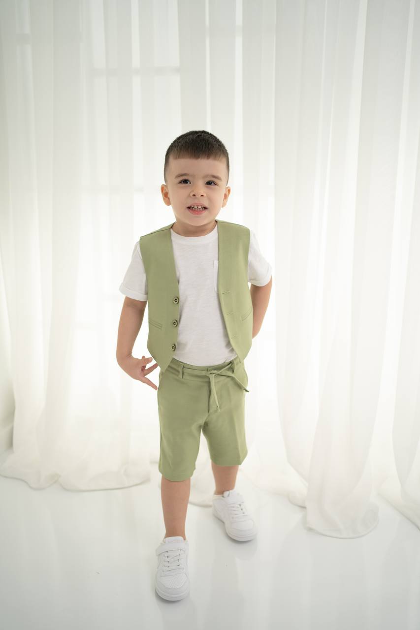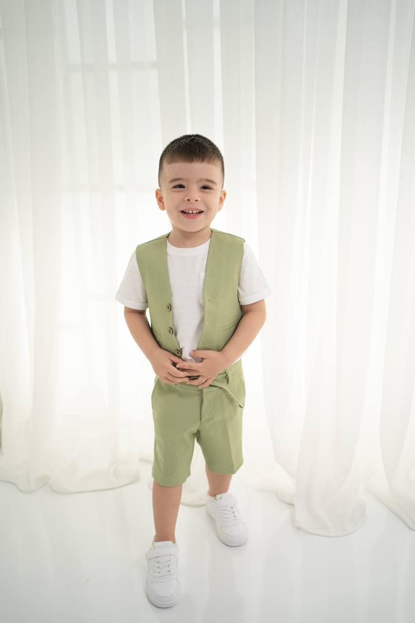 Şıklığın ve rahatlığın eşsiz birleşimi! Yeşil keten kumaştan tasarlanmış yelek, şık bir görünüm sunarken beyaz tişört ve uyumlu keten şort yazın serin ve konforlu bir deneyim sağlar. Özel günlerde veya günlük kullanımda çocukların hem rahat hem de stil sahibi görünmelerini sağlayacak bu üçlü set, kaliteli malzemesiyle uzun süreli kullanım imkânı sunar.